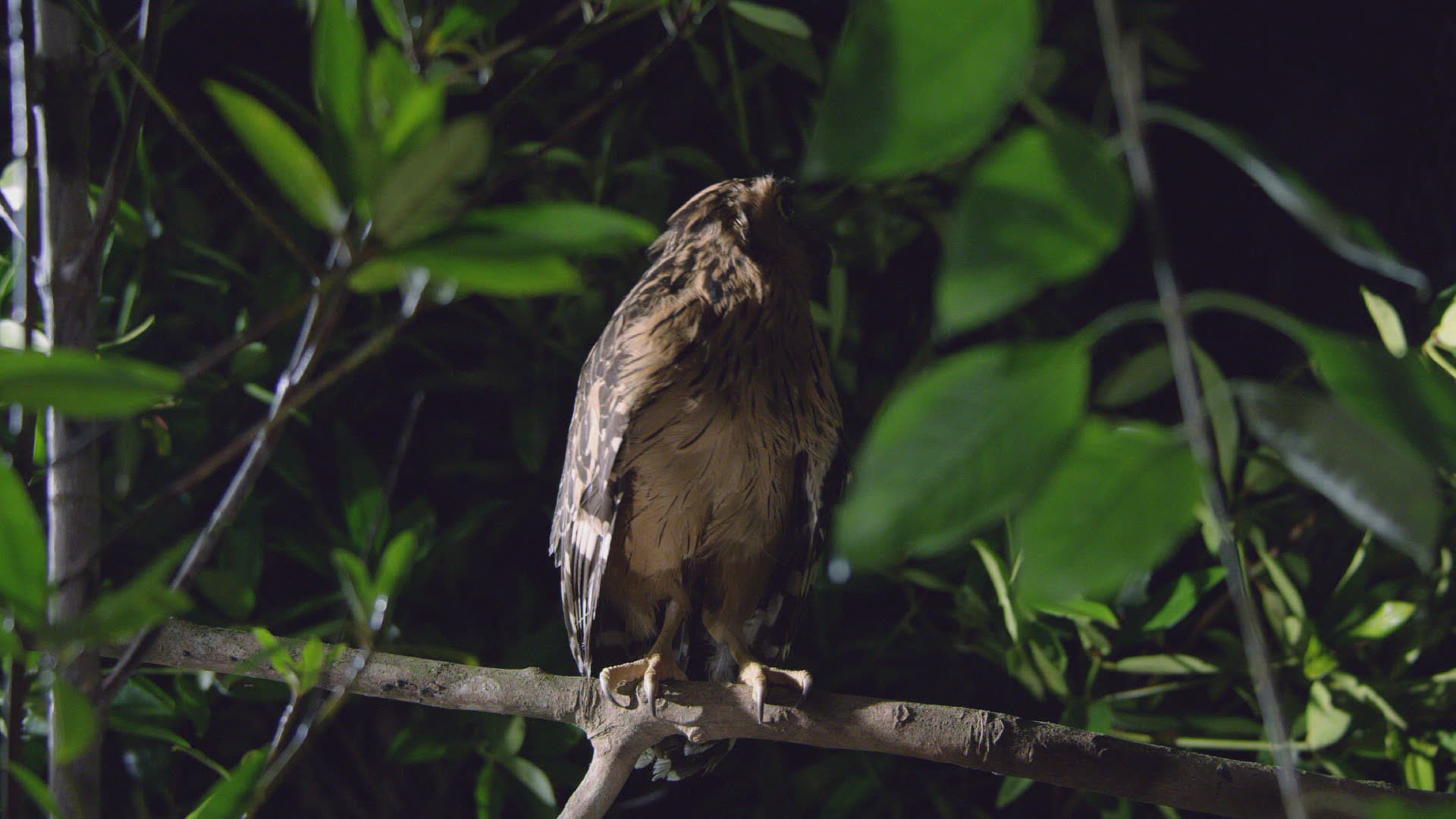 WS Buffy Fish Owl (Bubo ketupu) perching on branch then taking off and leaving / Borneo; Indonesia