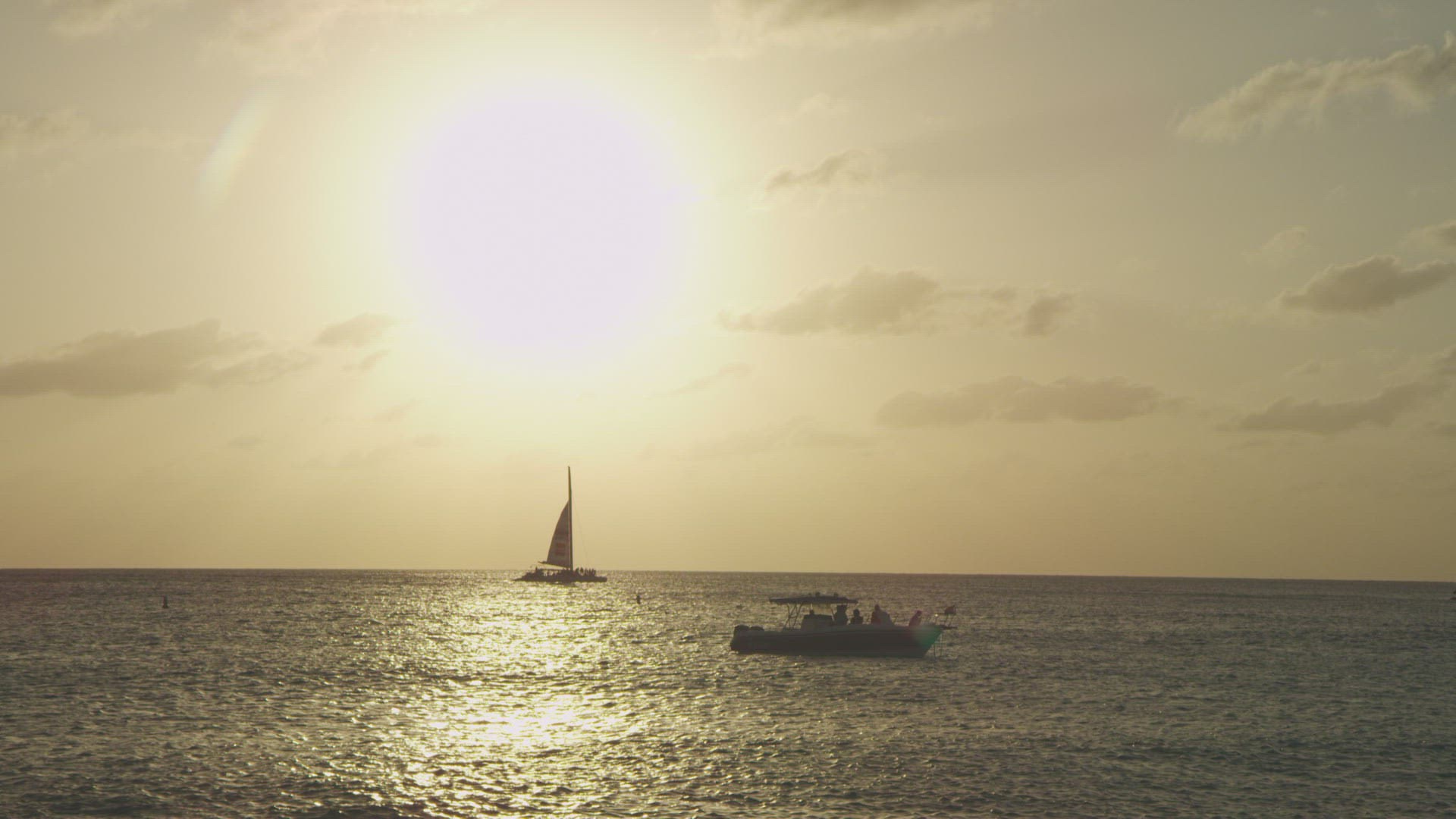 WS Motorboat and sailboat on rippled sea during sunset near Maho Beach / Sint Maarten