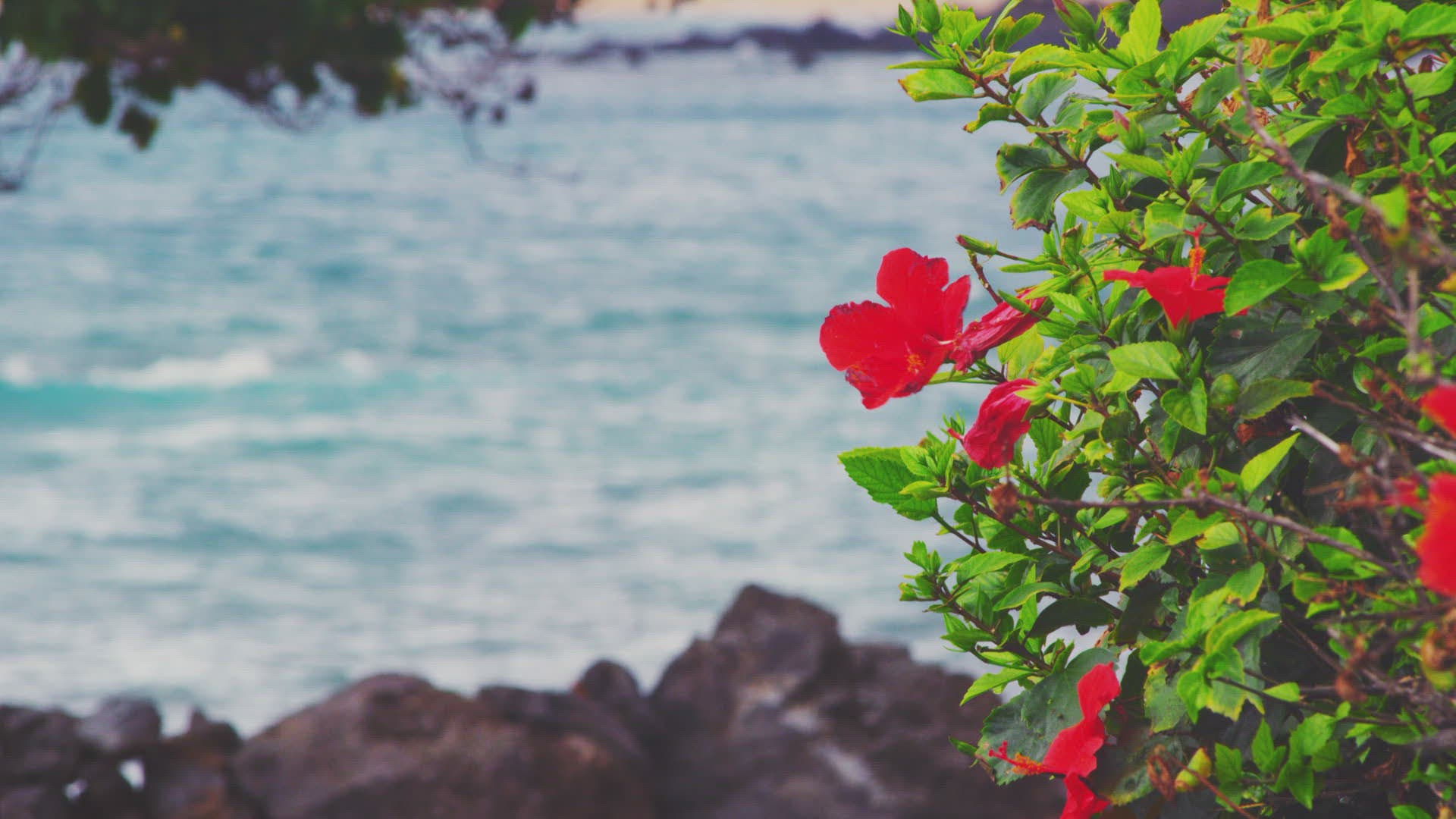 MS Red flowers blowing in wind against sea / Kihei; Maui; Hawaii; USA