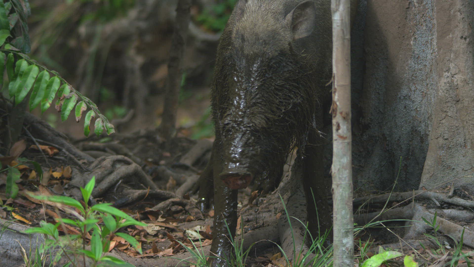 MS Bearded Pig (Sus barbatus) standing on Dipterocarp trees (Dipterocarp spp.) roots / Borneo; Indonesia