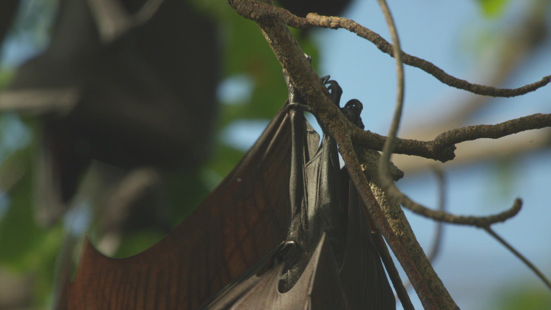 CU TD Black Flying Fox (Pteropus alecto) hanging from tree / Sulawesi; Indonesia