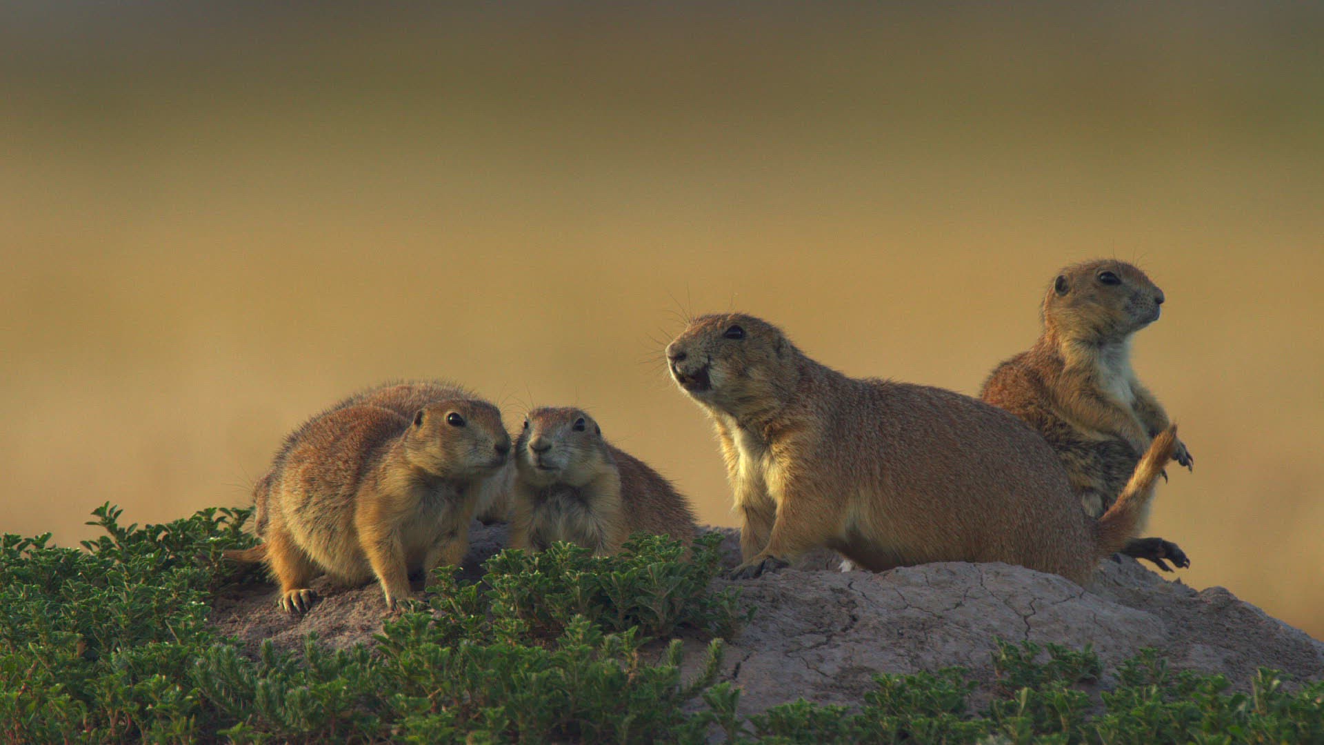 WS Prairie dogs (genus Cynomys) standing on rock in Badlands National Park / South Dakota; USA