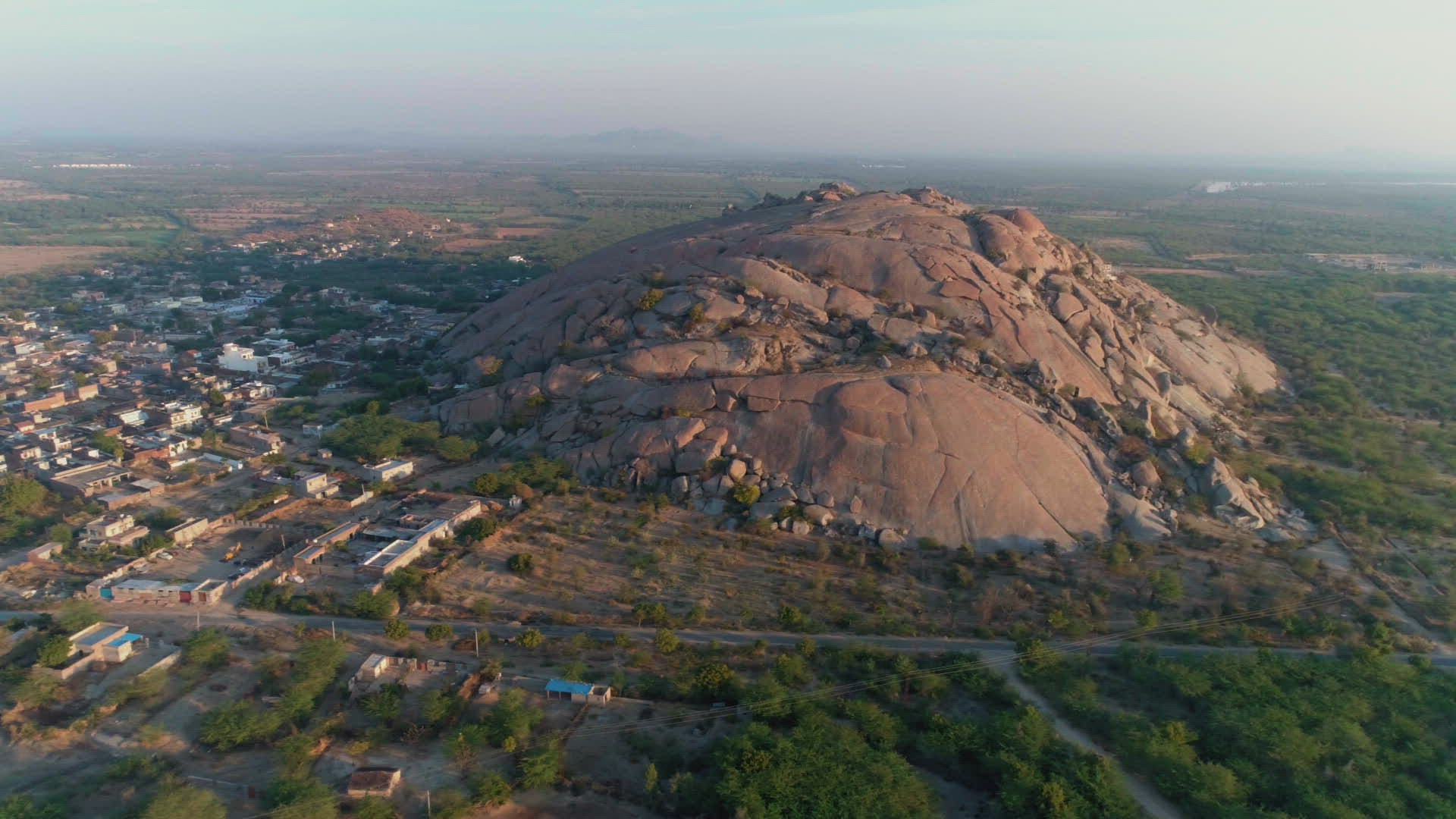 WS AERIAL Landscape with rocky hill / Rajasthan; India