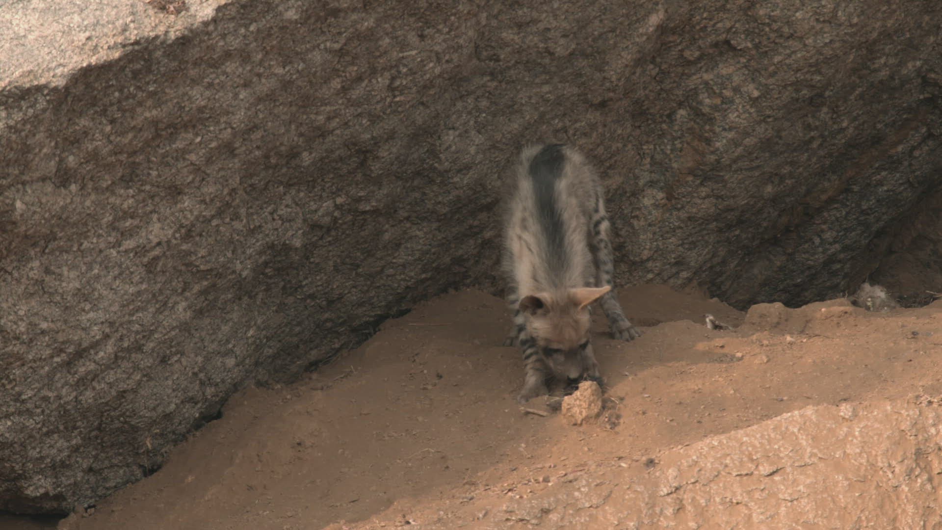 MS Striped hyena (Hyaena hyaena) standing near rocks / Rajasthan; India