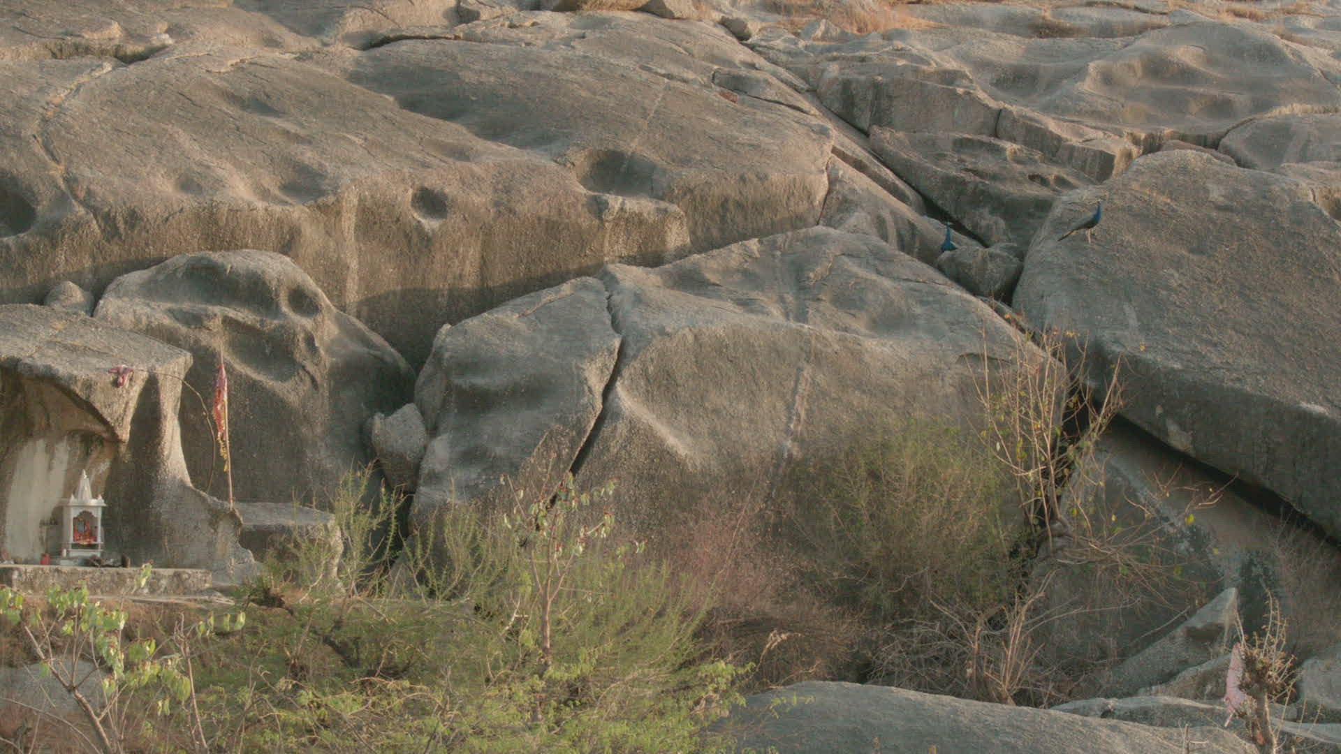 WS Blue peafowls (Pavo cristatus) on rocks / Rajasthan; India