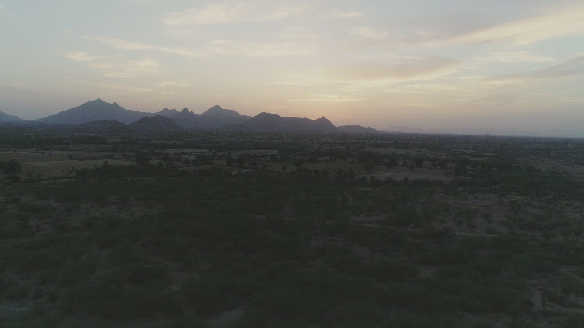 WS AERIAL Landscape with plain and rocky mountains at dusk / Rajasthan; India