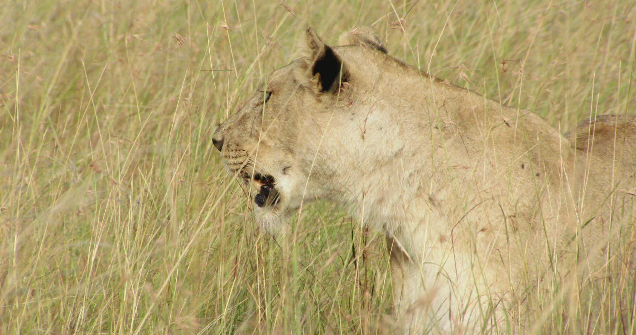 MS SELECTIVE FOCUS Lion (Panthera leo) dirty with blood in grass in savannah / Kenya