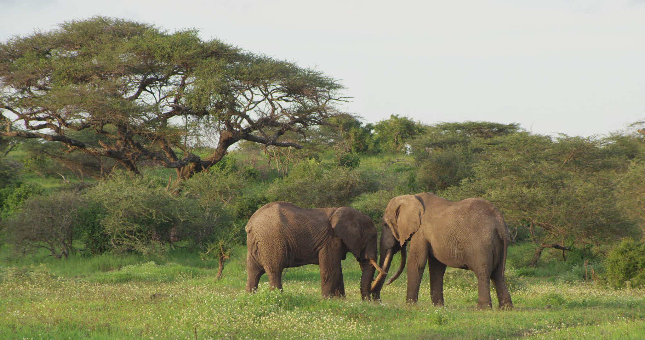 SLO MO WS Elephants (Loxodonta africana) grazing in savannah / Kenya