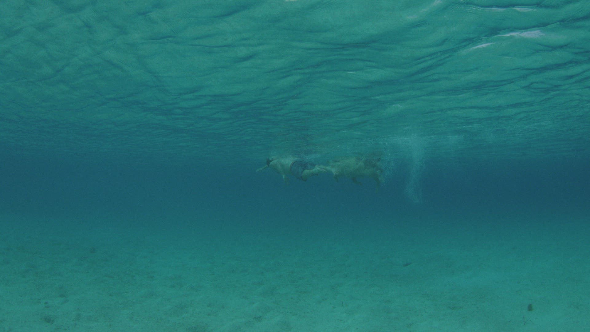 MS Underwater view of man swimming in sea with Feral Pig (Sus scrofa domesticus) / The Bahamas