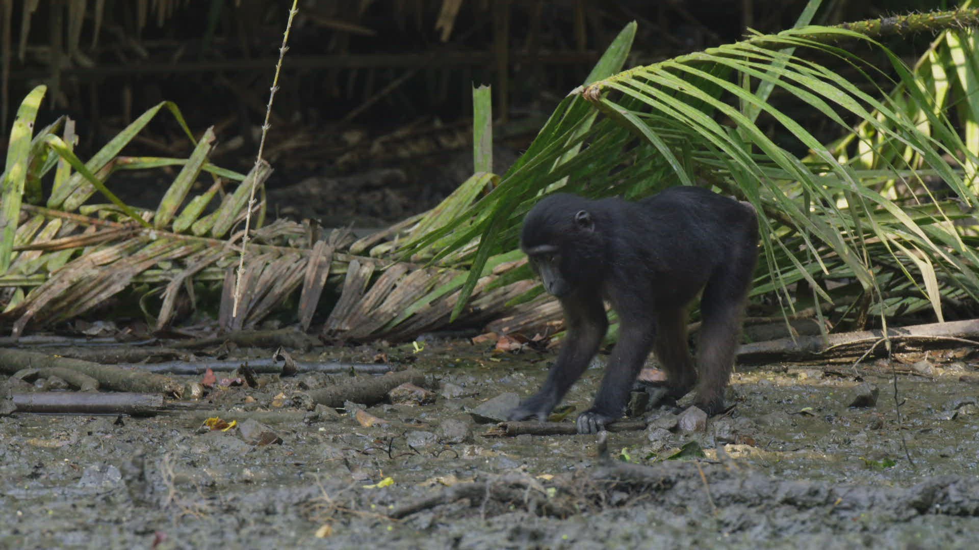 WS TS SELECTIVE FOCUS Heck’s Macaque (Macaca hecki) walking on fallen tree / Sulawesi; Indonesia