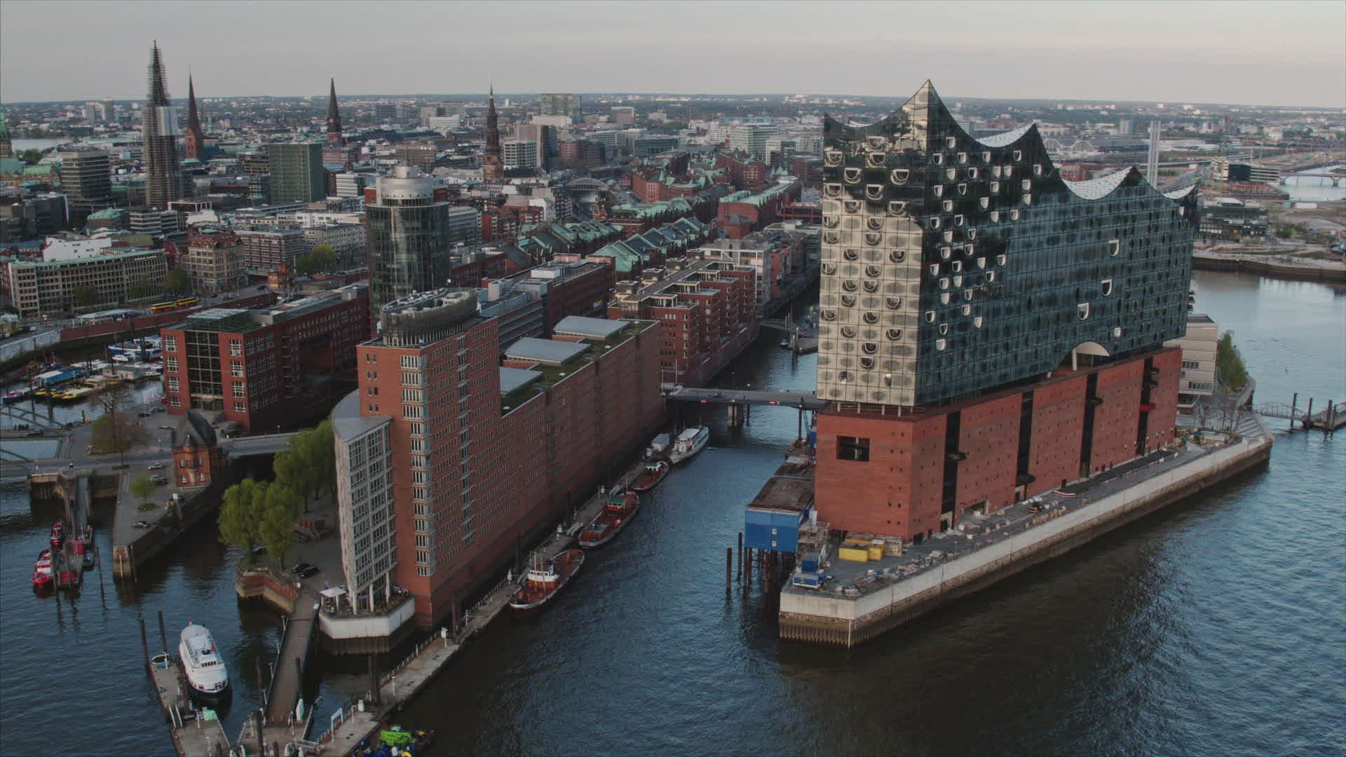 Hamburg Harbour. Areal shot of Elbphilharmonie and harbour area - late afternoon-light.