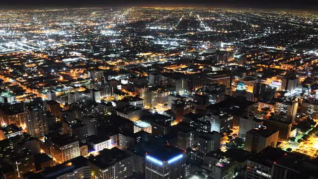 Time lapse with pan motion of downtown Los Angeles cityscape at night shot from building top