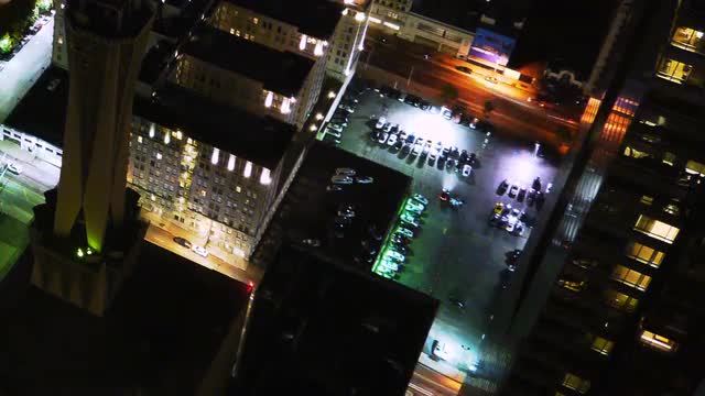 Time lapse of a busy parking lot in downtown Los Angeles cityscape at night shot from building top