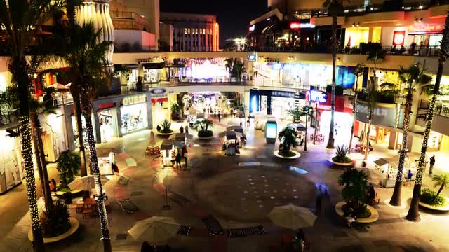 Time lapse footage with tilt down motion of a shopping mall in Hollywood at night
