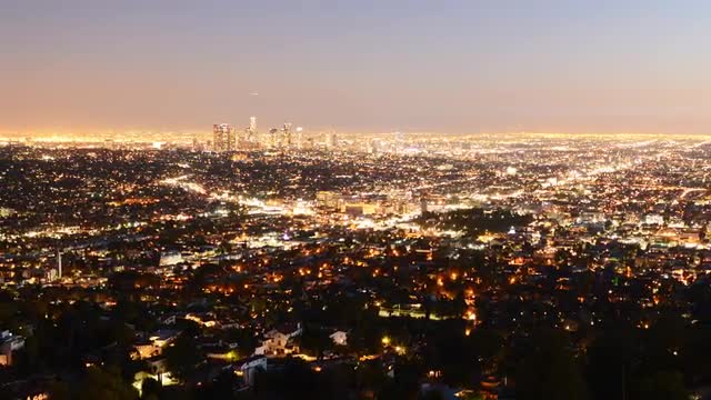 Time lapse with zoom out motion of downtown LA seen from distance during sunset
