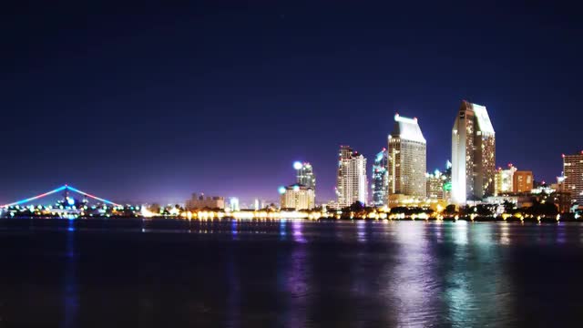 Time lapse of San Diego skyline at night shot from Colonado Island