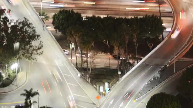 Time Lapse with pan up motion of a busy freeway ramp in downtown Los Angeles at rush hour in the evening