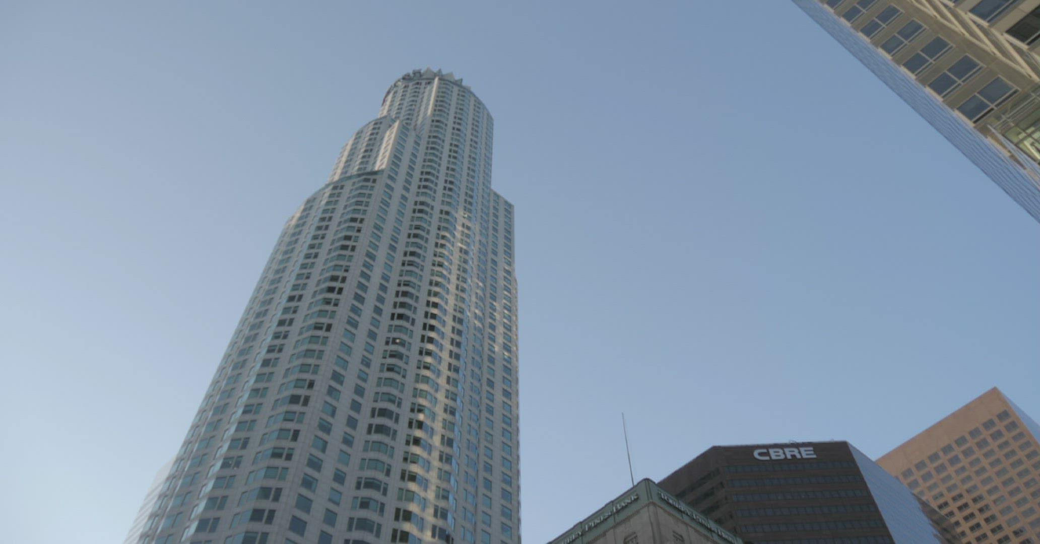 Time lapse footage with tilt down motion of busy intersection in Downtown Los Angeles during rush hour