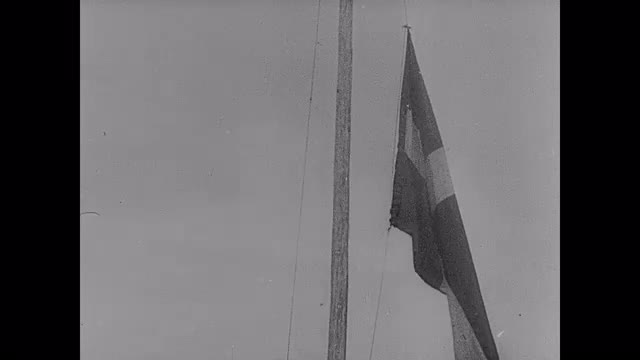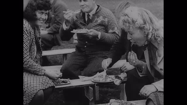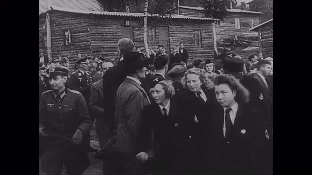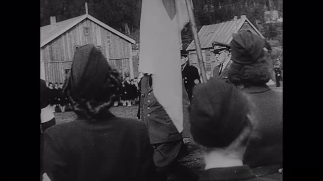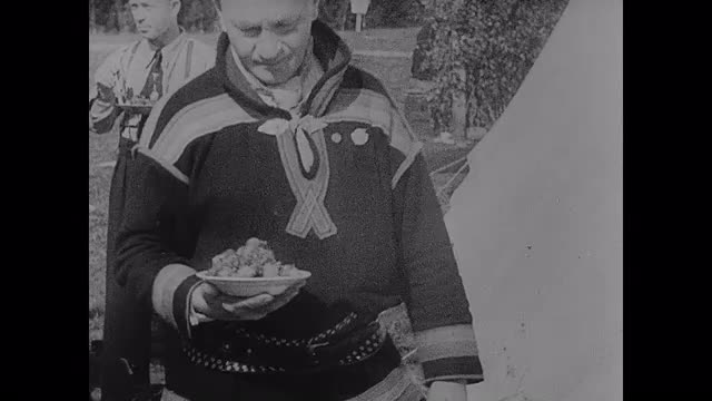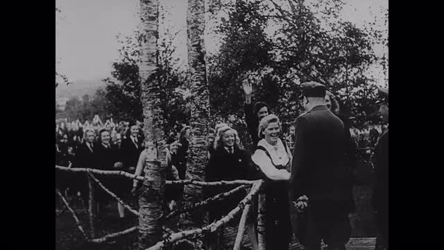 1944; Norway: Scenes in a Norwegian camp for fascist youth. Man in Norwegian costume gets his portion in the field kitchen. Men in uniform and civilians eat in front of tents and sit on benches.