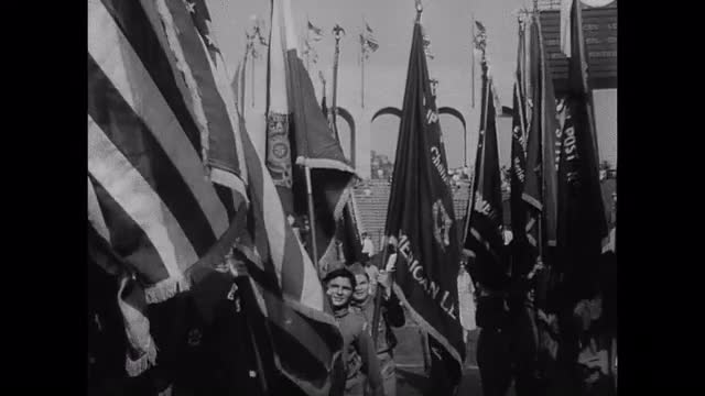 1956: AMERICAN LEGION. The inimitable Big Parade opens the 38th annual National Convention of the American Legion; the biggest and most spectacular ever staged. It's a ten hour Parade of Patriotism. (also in clip: Carol Morris; Miss Universe 1956)