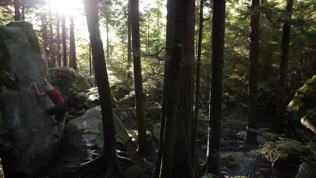 Rock climbing a boulder in a dense rain forest in Squamish, British Columbia.