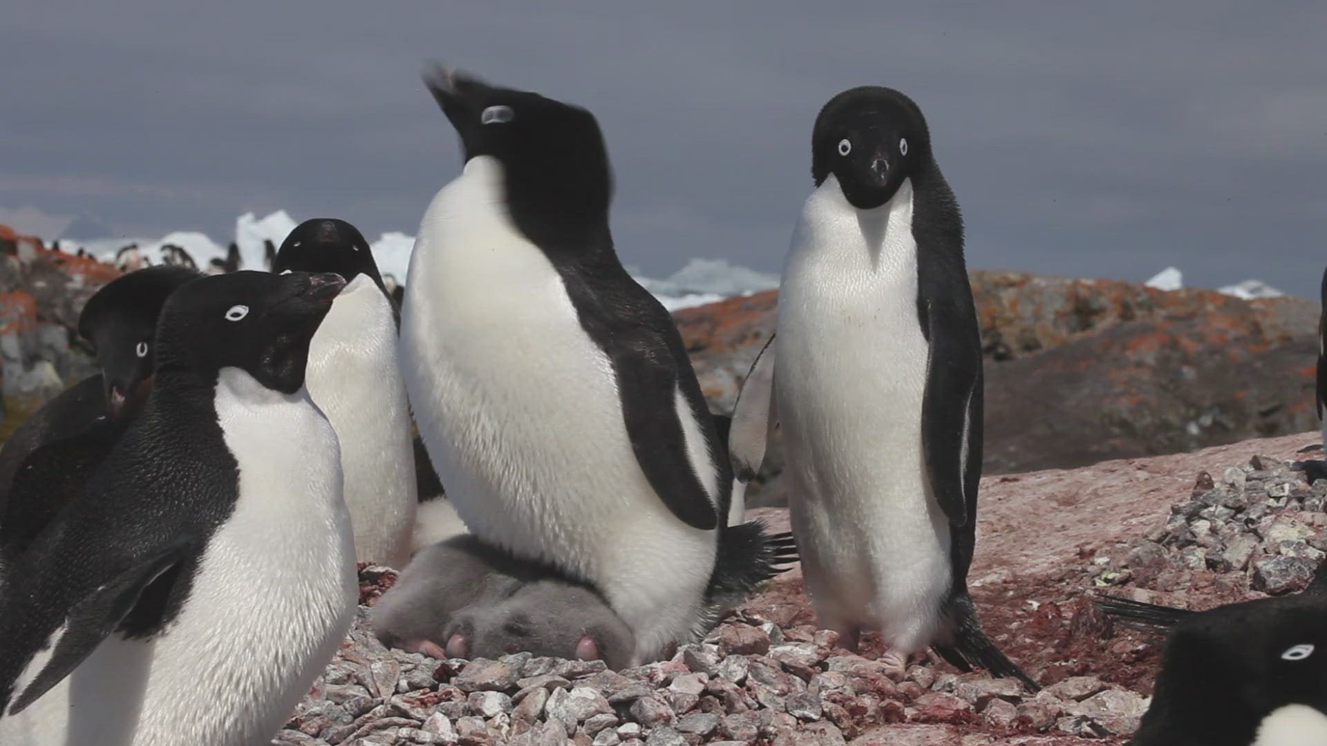 Adelie penguin (Pygoscelis adeliae) med adults with chicks and others around them; some display; Antarctica