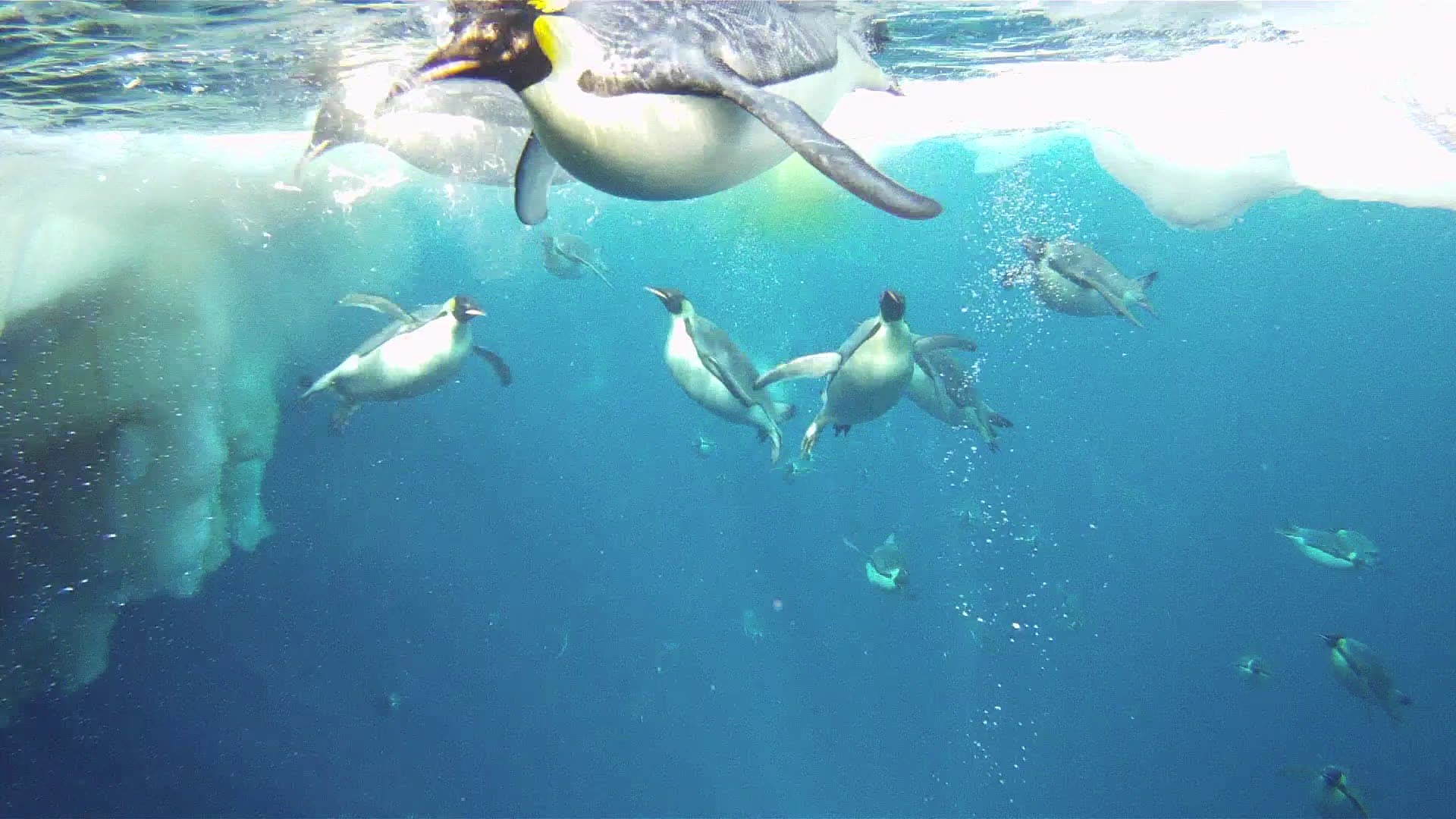 Emperor penguins (Aptenodytes forsteri) at surface and diving; underwater; Cape Washington; Antarctica