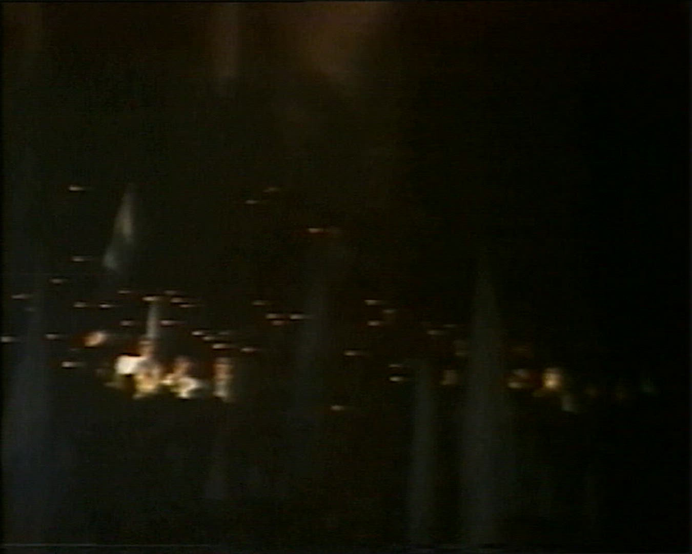 A lone flashlight shines through trees and branches on a misty night.