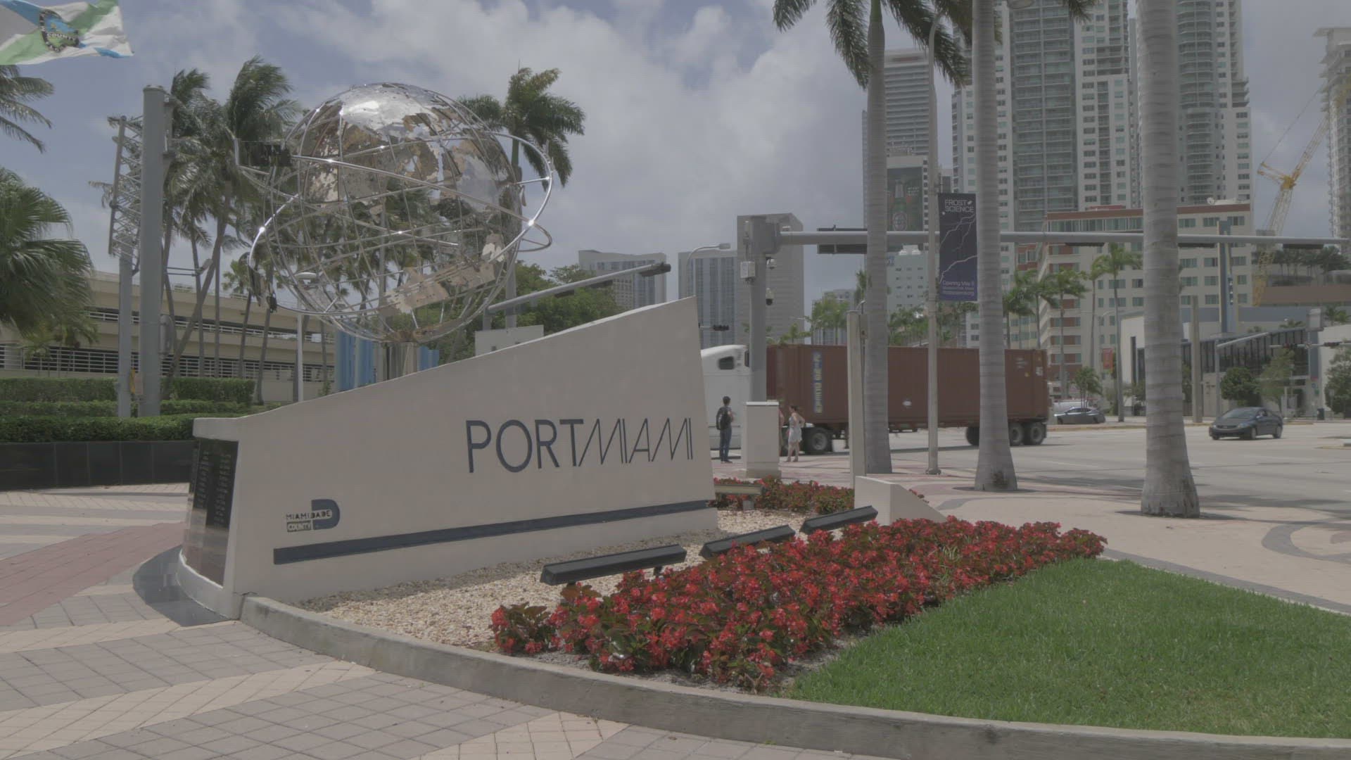 View of Port of Miami entrance sign; Downtown; Miami; Florida; United States of America; North America