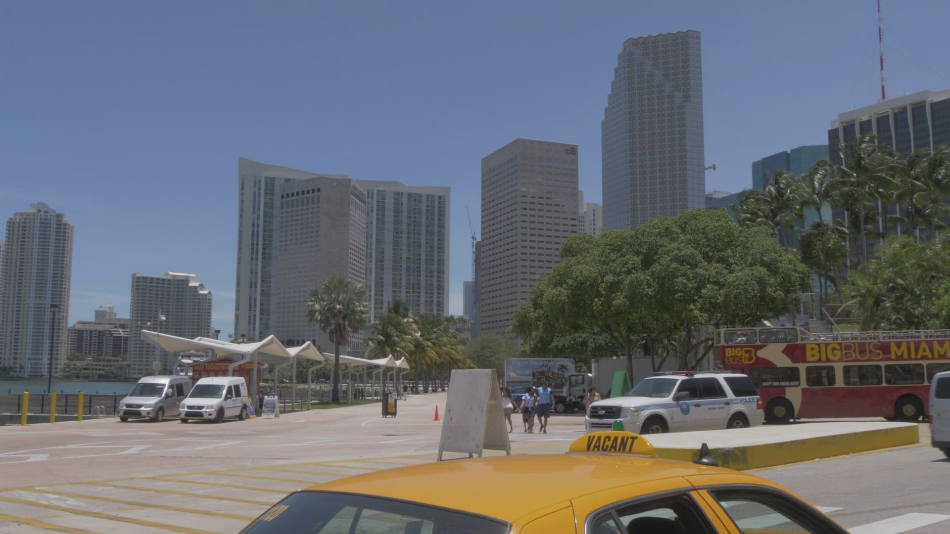 View of yellow cab and Bayside Shopping Mall; Downtown; Miami; Florida; United States of America; North America