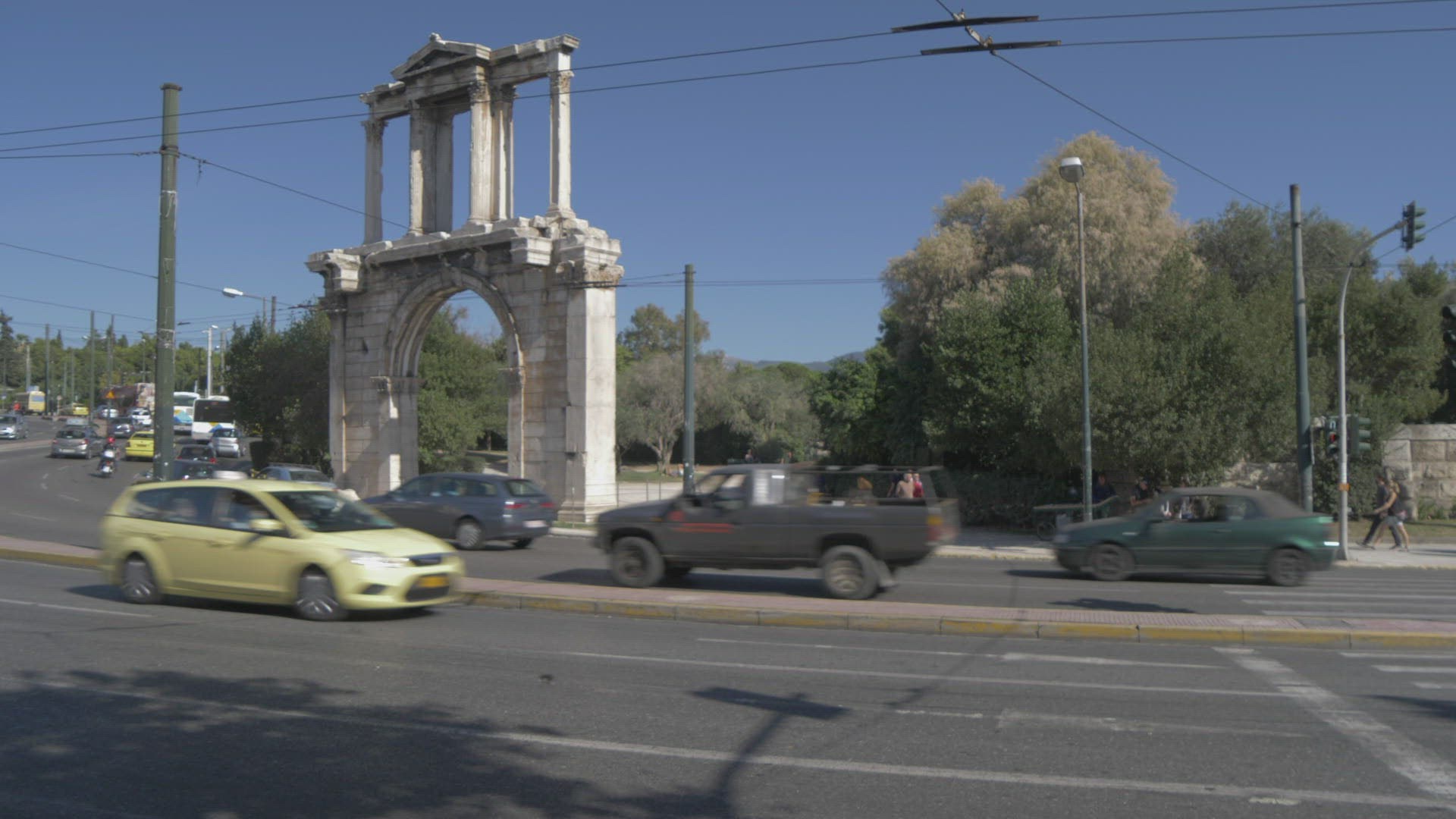 View of Hadrian's Arch and traffic on busy road; Athens; Greece; Europe