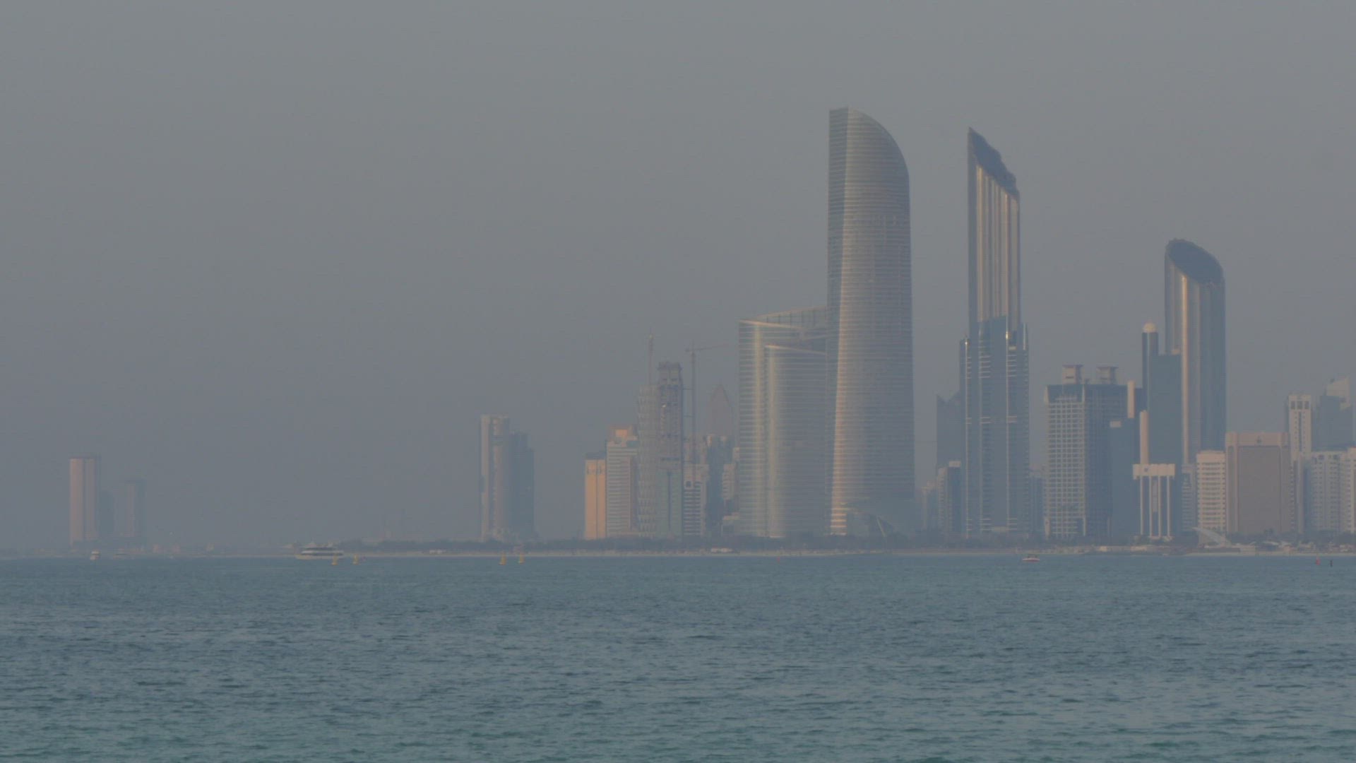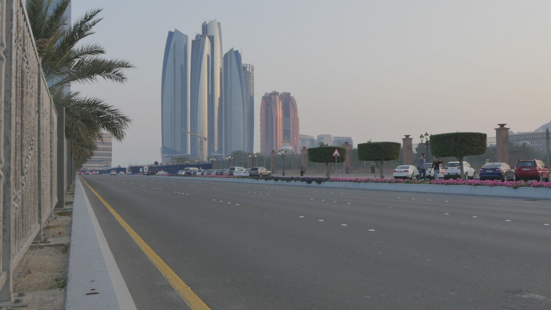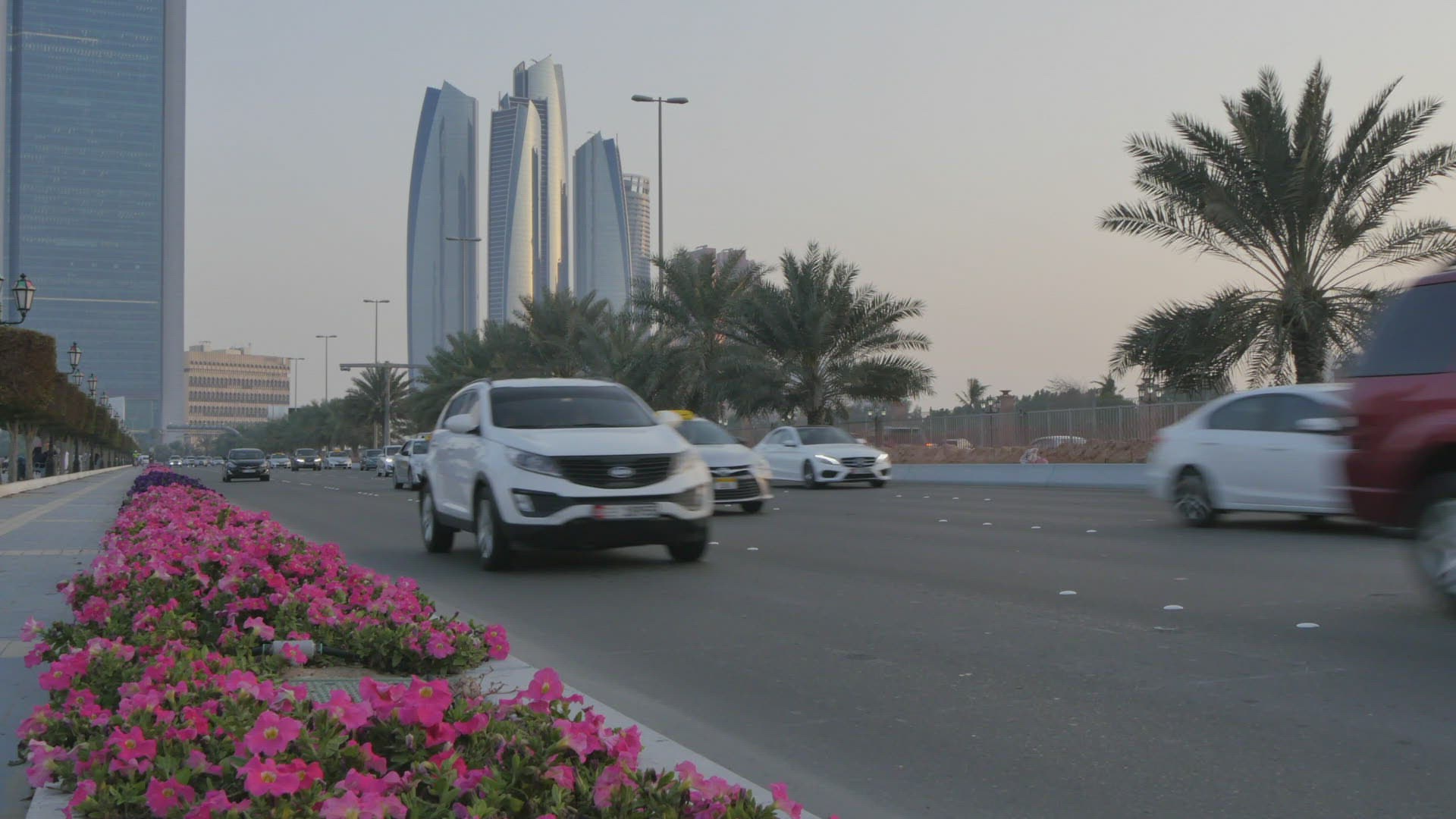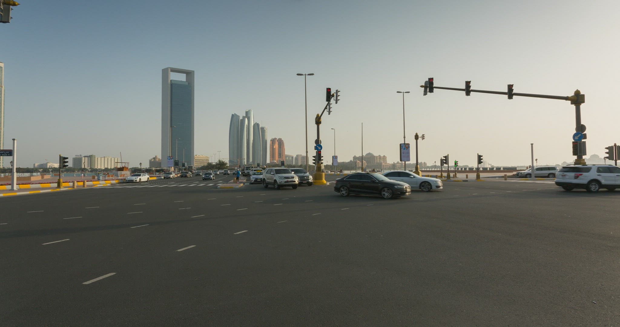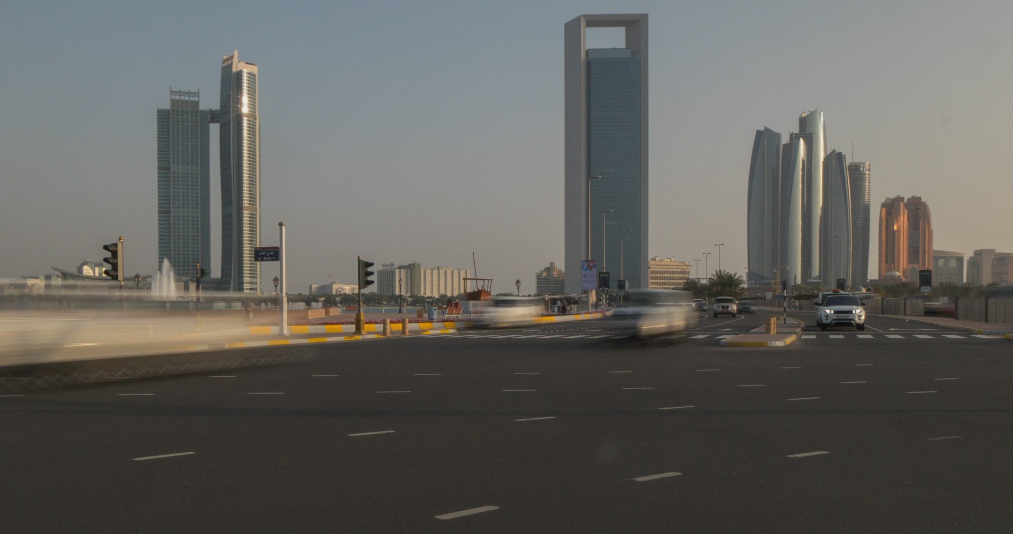 View from 18th Street of traffic and Atlantis Hotel on Al Marina at dusk; Abu Dhabi; United Arab Emirates; Middle East; Asia