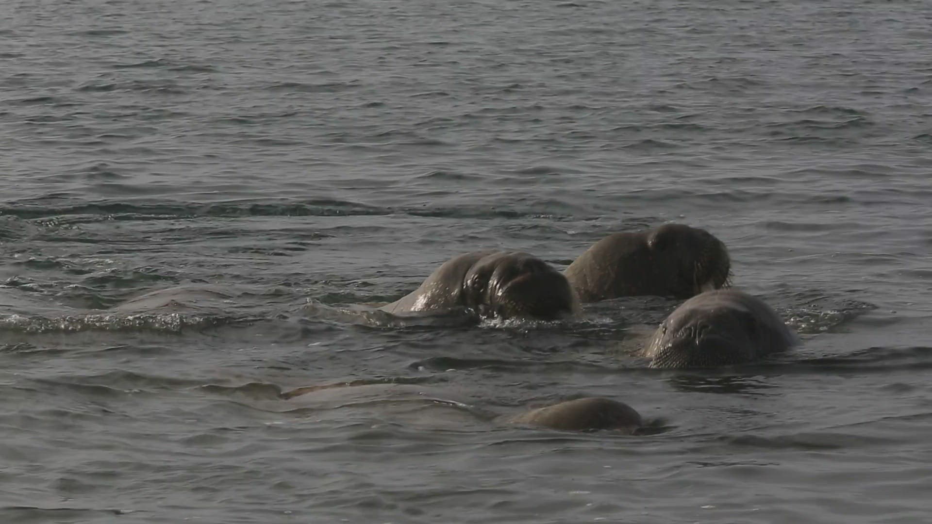 Walrus (Odobenus rosmarus); medium shot of group in shallows; Antarctica