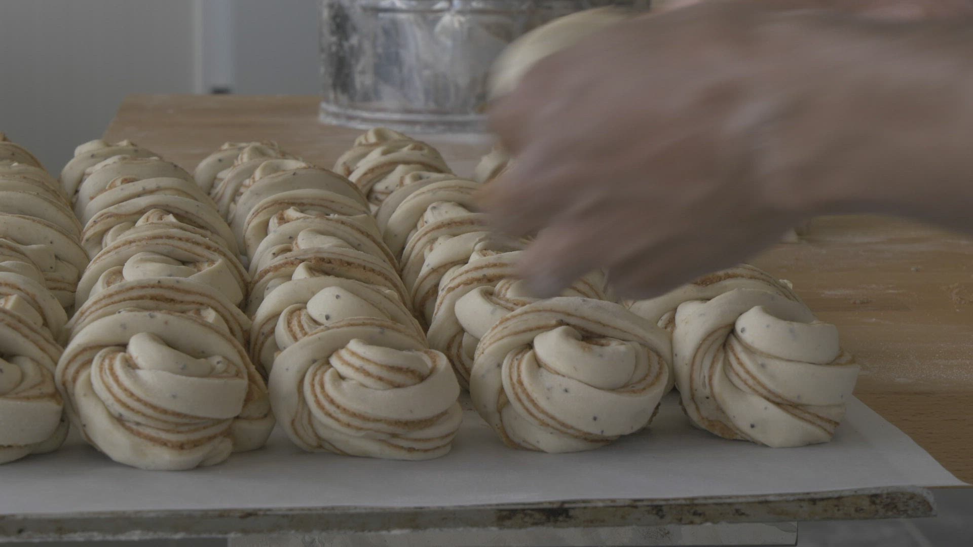 Close up shot of Cinnamon Buns Cake being made in cafe in Gamla Stan; Stockholm; Sweden; Scandinavia; Europe