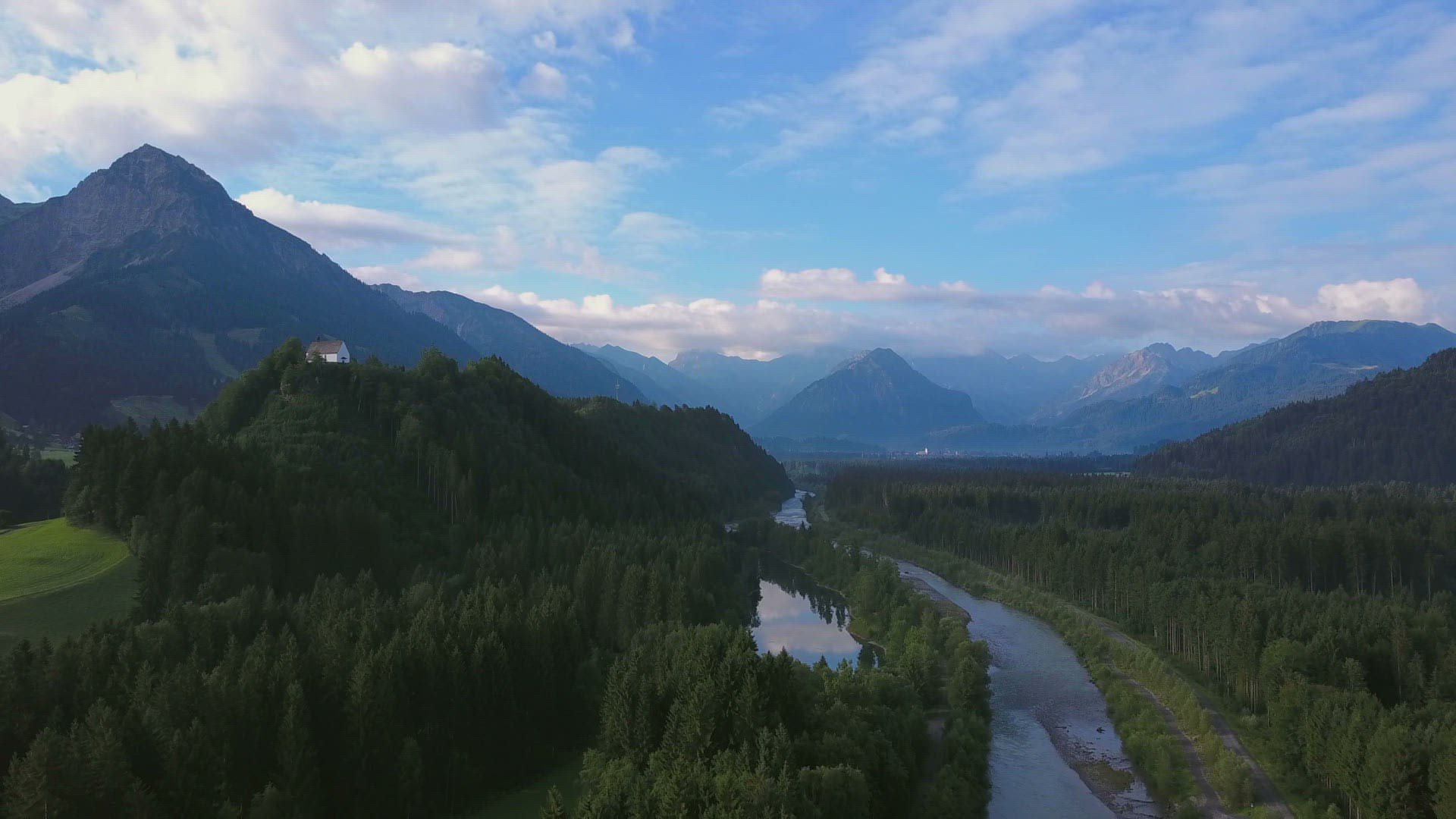 Aerial view of Iller River near Fischen with Castle Church of Schoellang; Allgau Alps; Allgau; Swabia; Bavaria; Germany; Europe