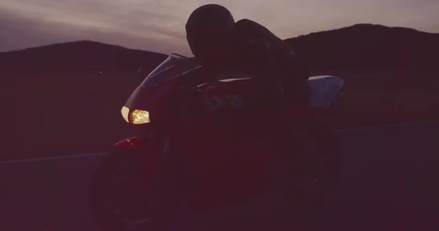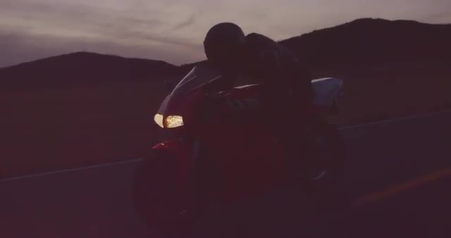 921267 - Motorcyclist racing his motorcycle down straight country road going a high speed at sunset