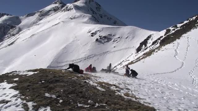 Helicopter taking off from the alpine with group of people
