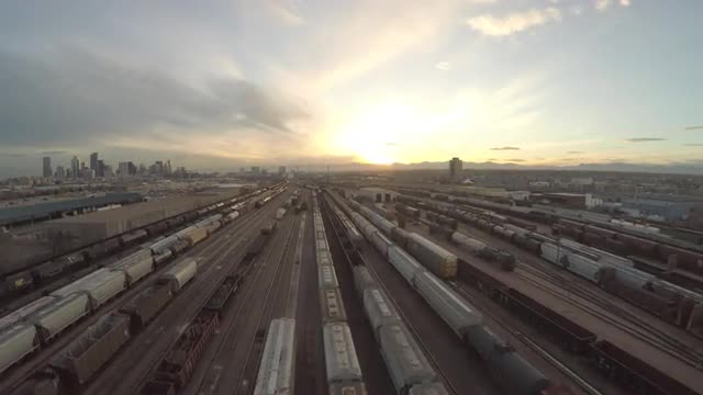 Aerial of Train Yard at Sunset