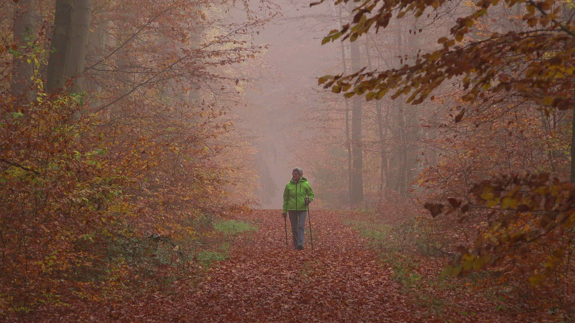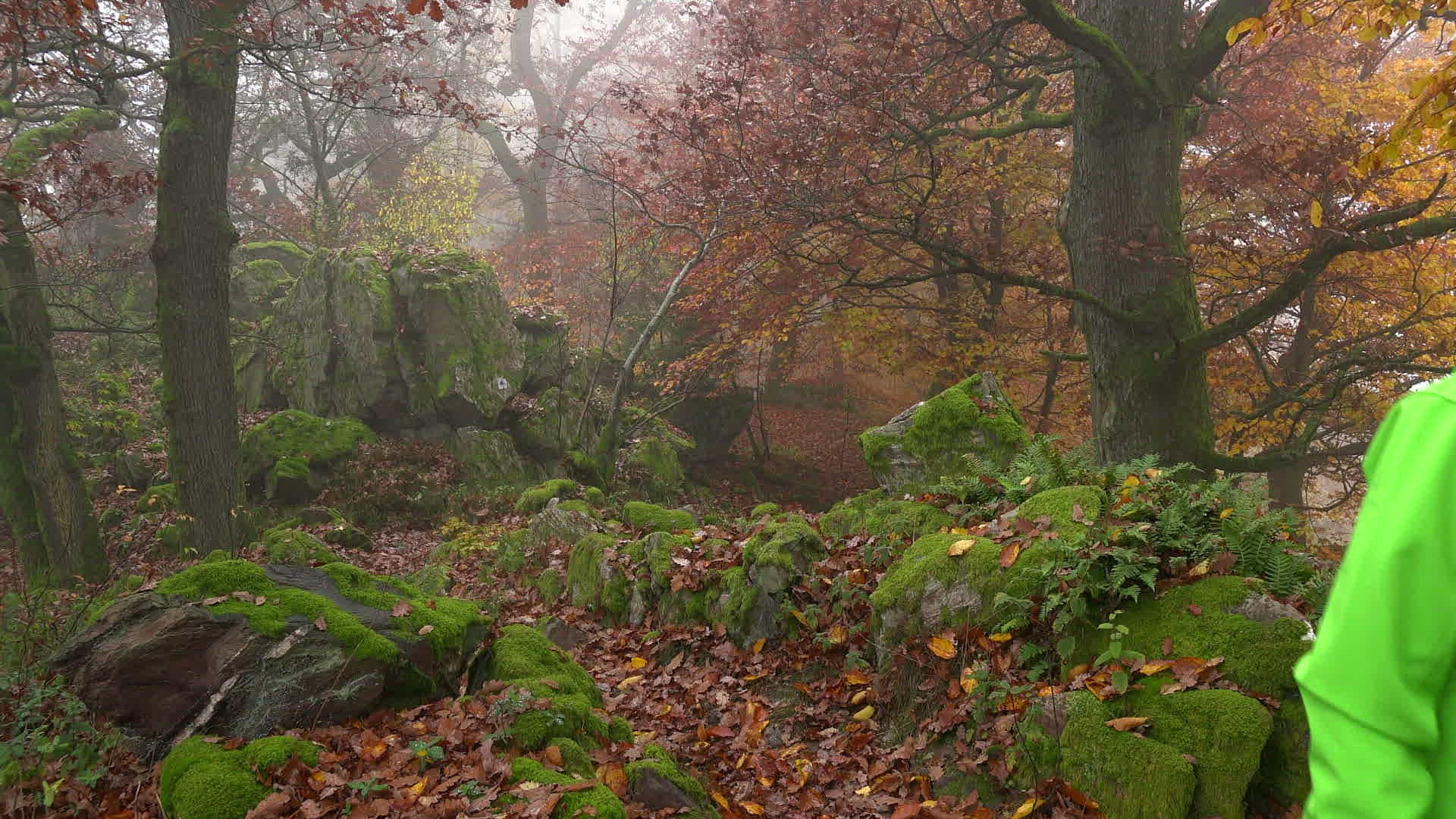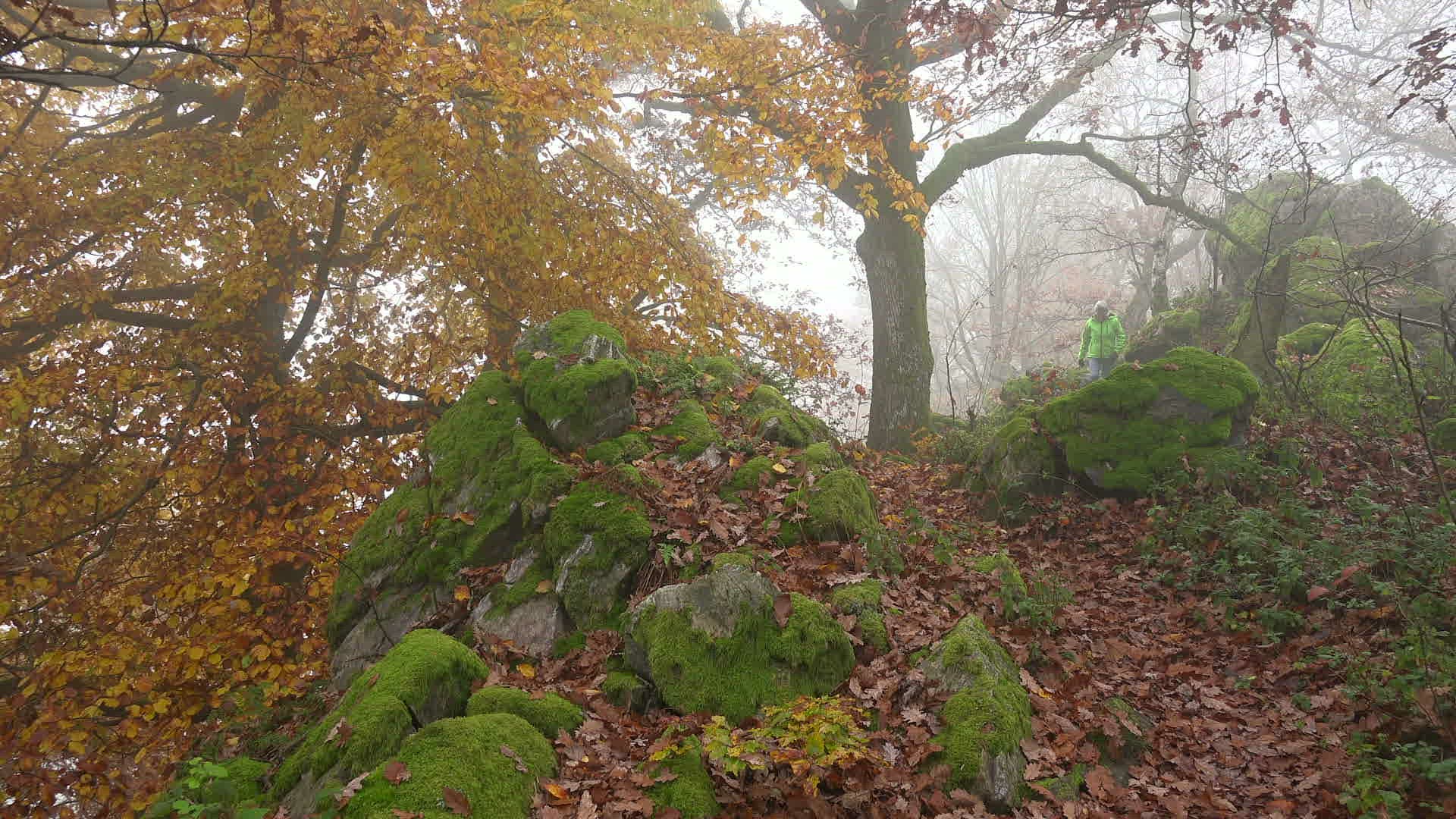 Female walker in autumnal forest; Mount Maunert near Freudenburg; Saar Valley; Rhineland-Palatinate; Germany; Europe