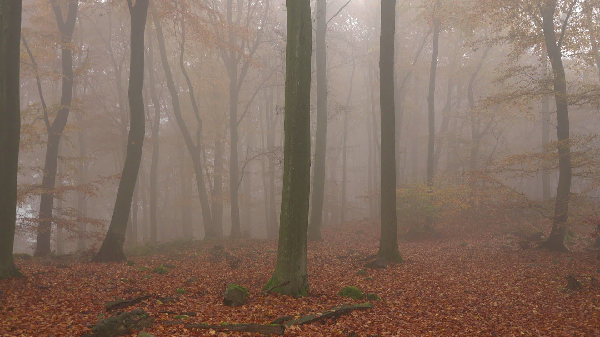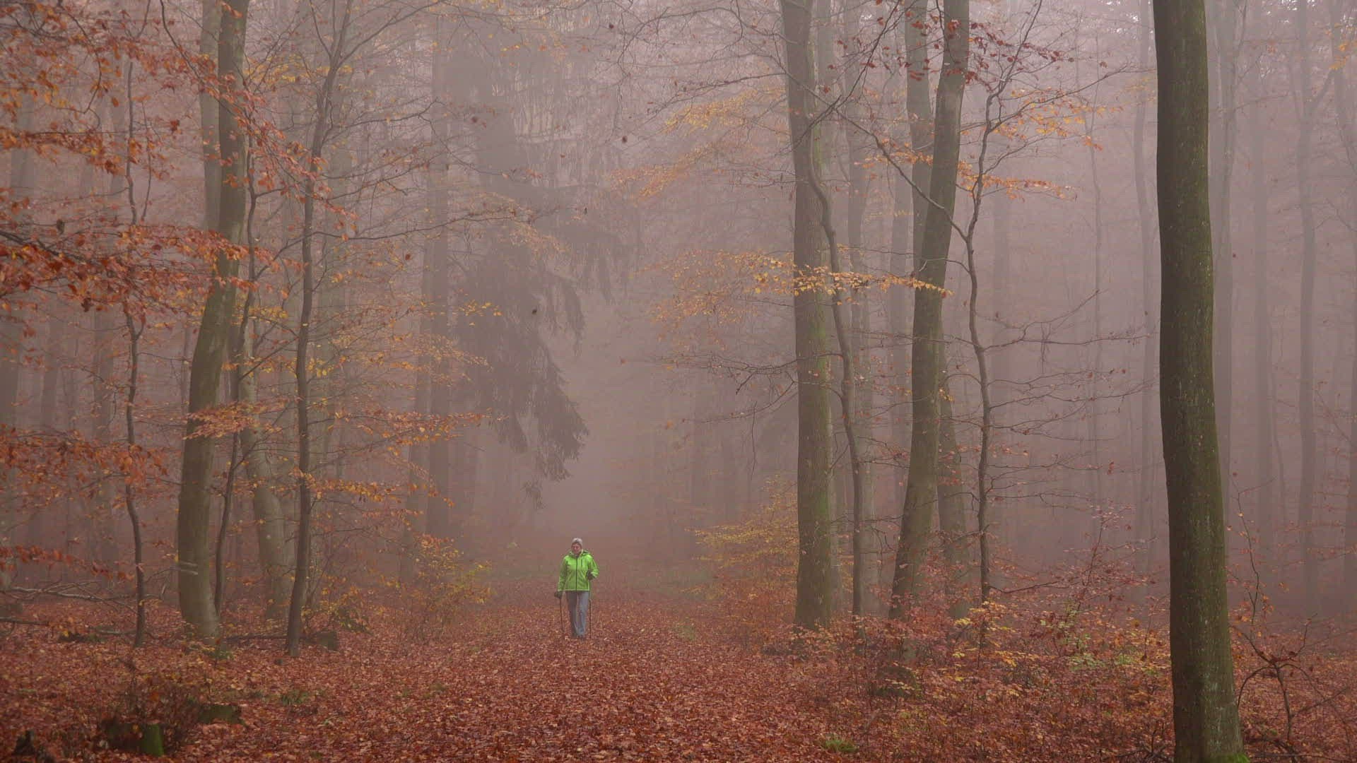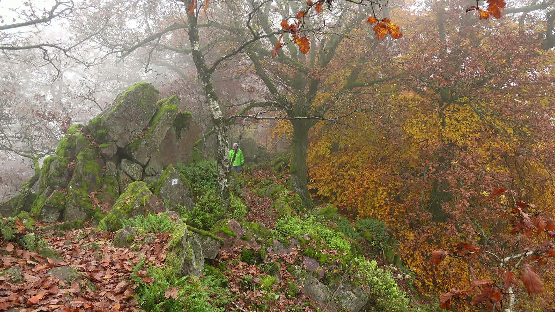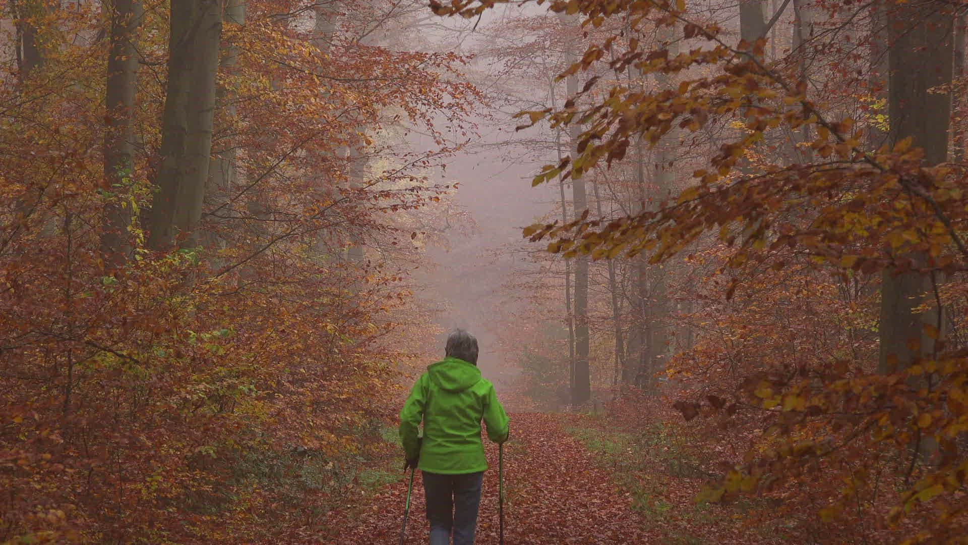 Female walker in autumnal forest; Mount Maunert near Freudenburg; Saar Valley; Rhineland-Palatinate; Germany; Europe