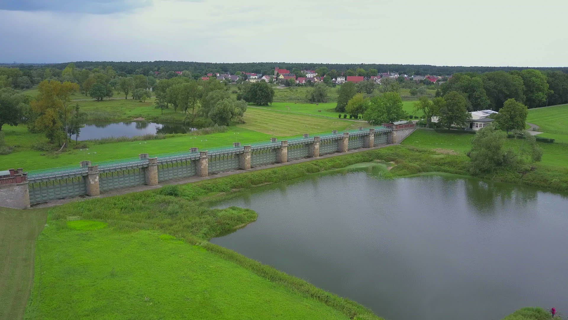 Aerial view of the installation for flood control Pretziener Wehr (Weir of Pretzien) in Pretzien near Magdeburg; Elbe Valley; Saxony-Anhalt; Germany