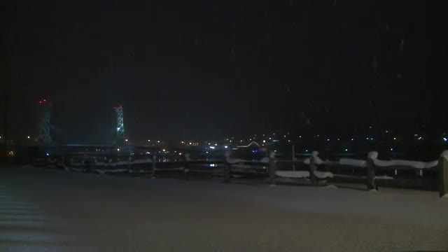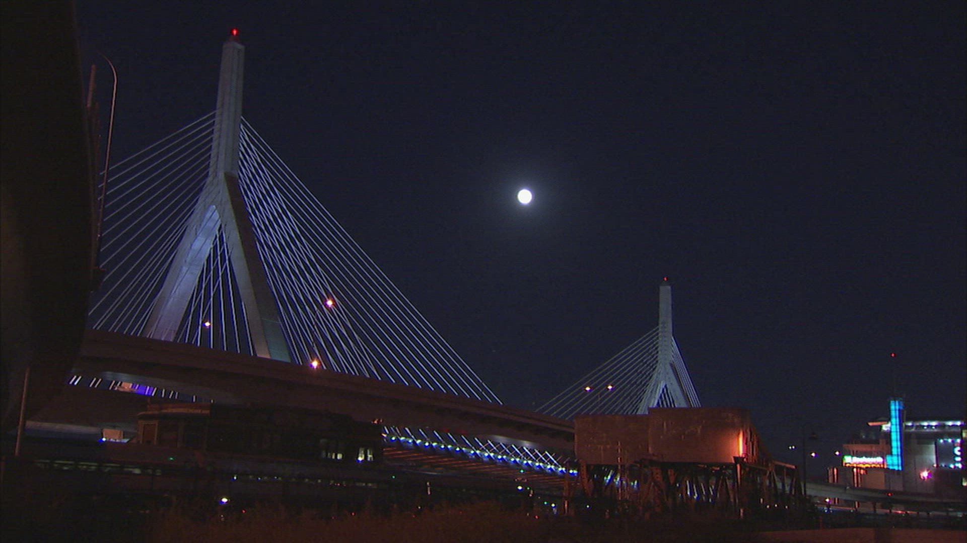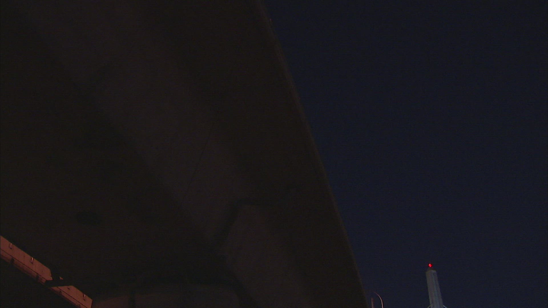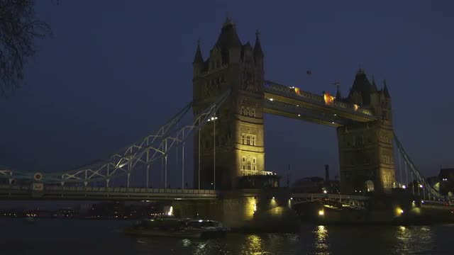 Bridge at night, camera pans back and forth.