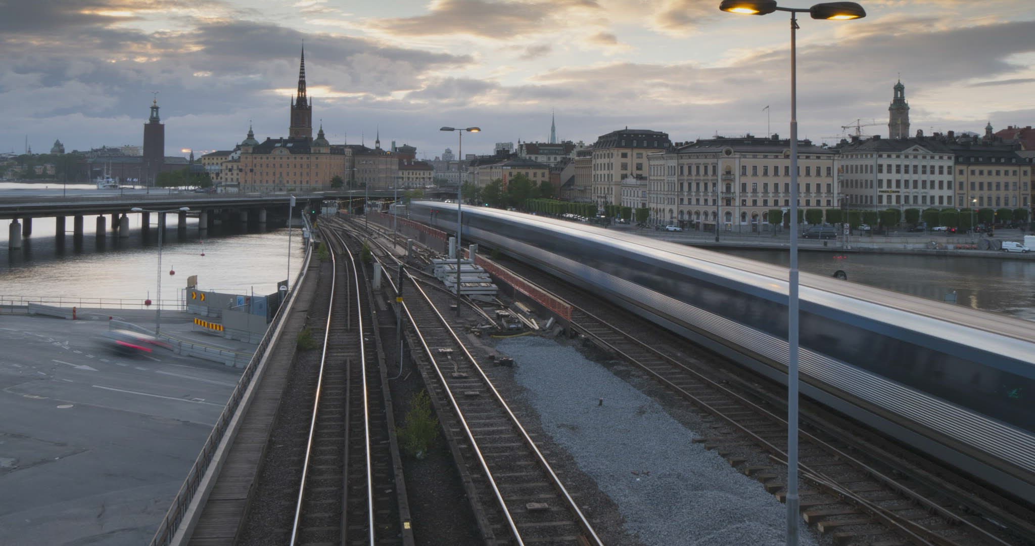 Time lapse of trains towards Gamla Stan from Slussen; Stockholm; Sweden; Scandinavia; Europe