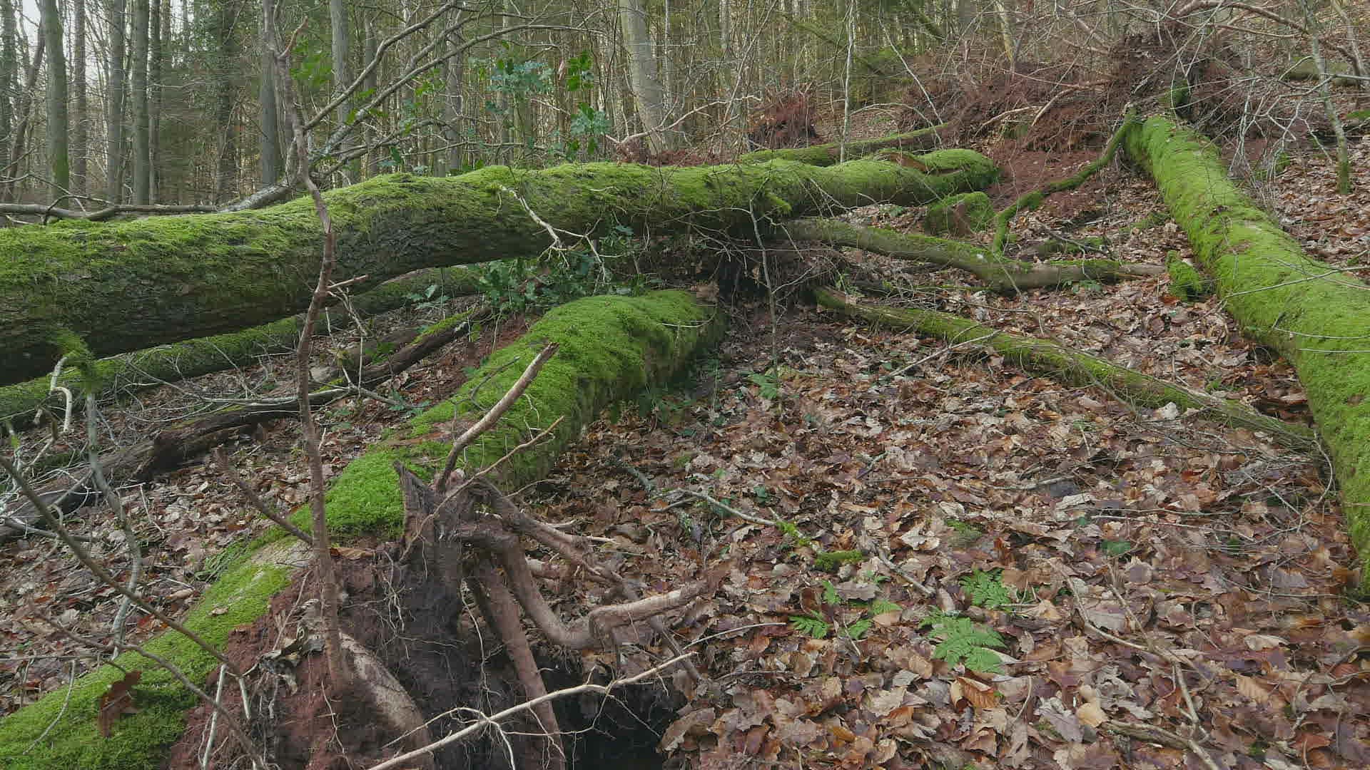 Wind breakage; uprooted trees in forest after storm