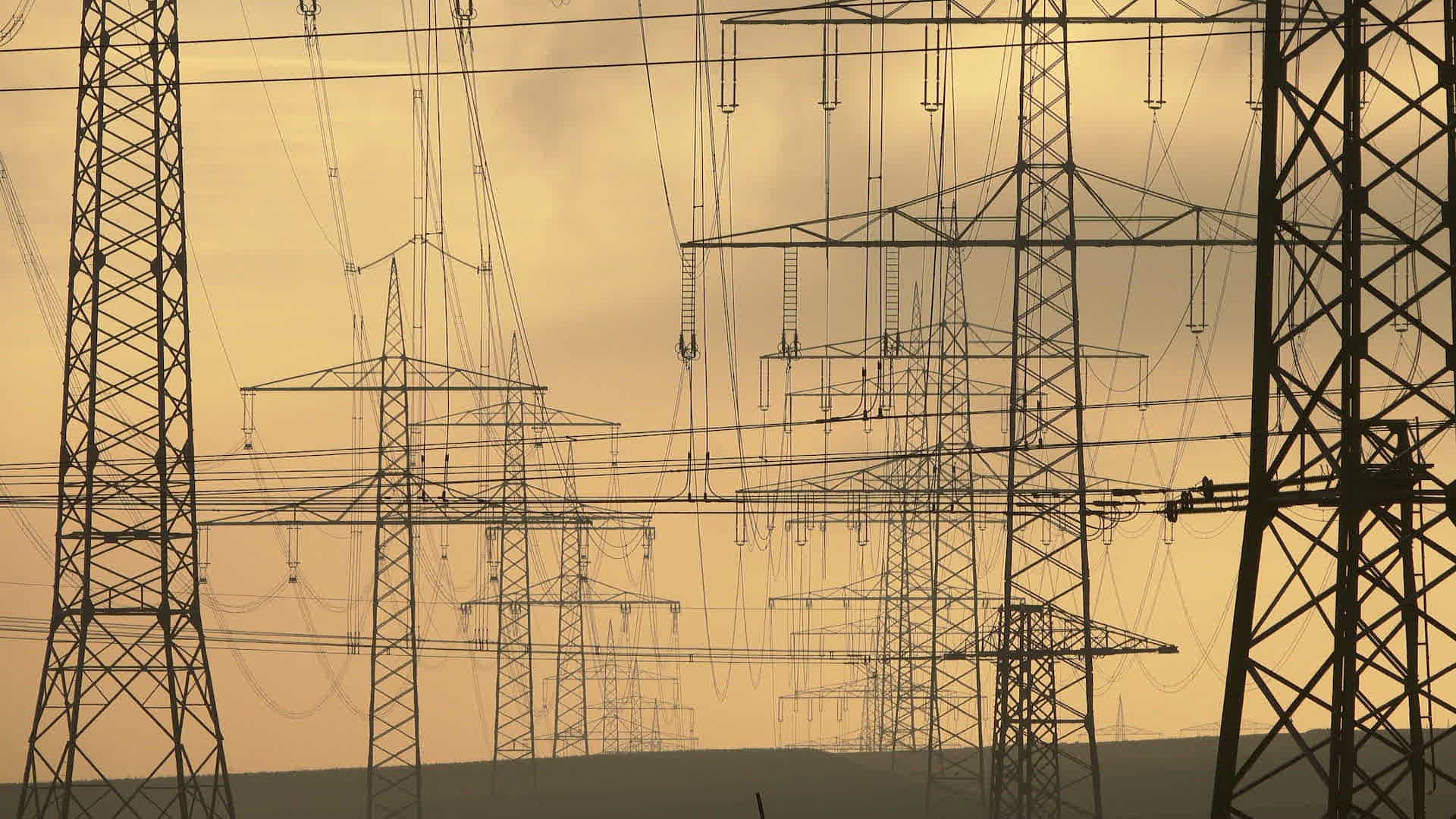 Power Lines in morning light near Neurath; Grevenbroich; North Rhine-Westphalia; Germany; Europe