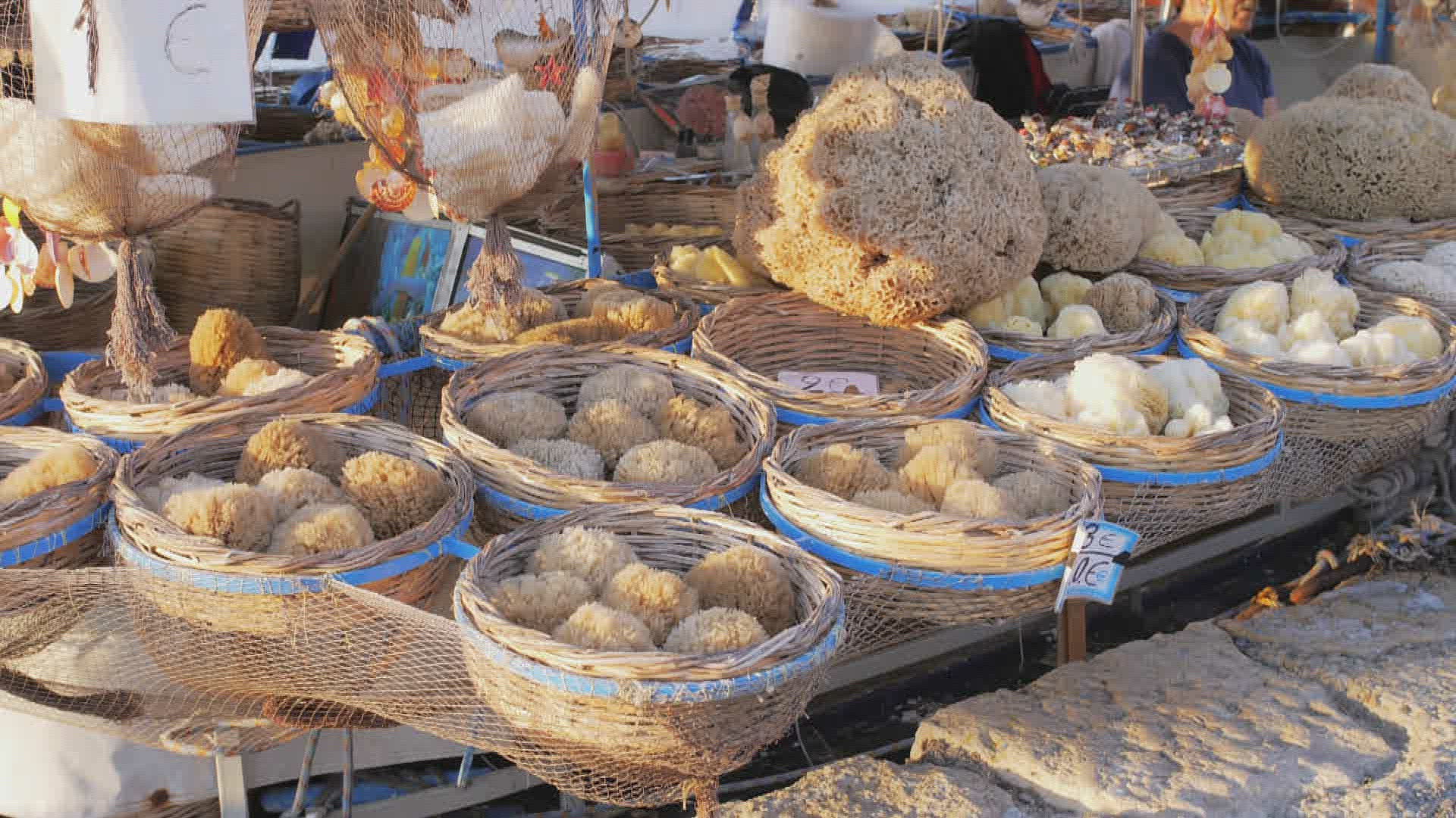 Souvenirs and sea sponge for sale on a boat in Chania, Crete, Greek Islands, Greece, Europe