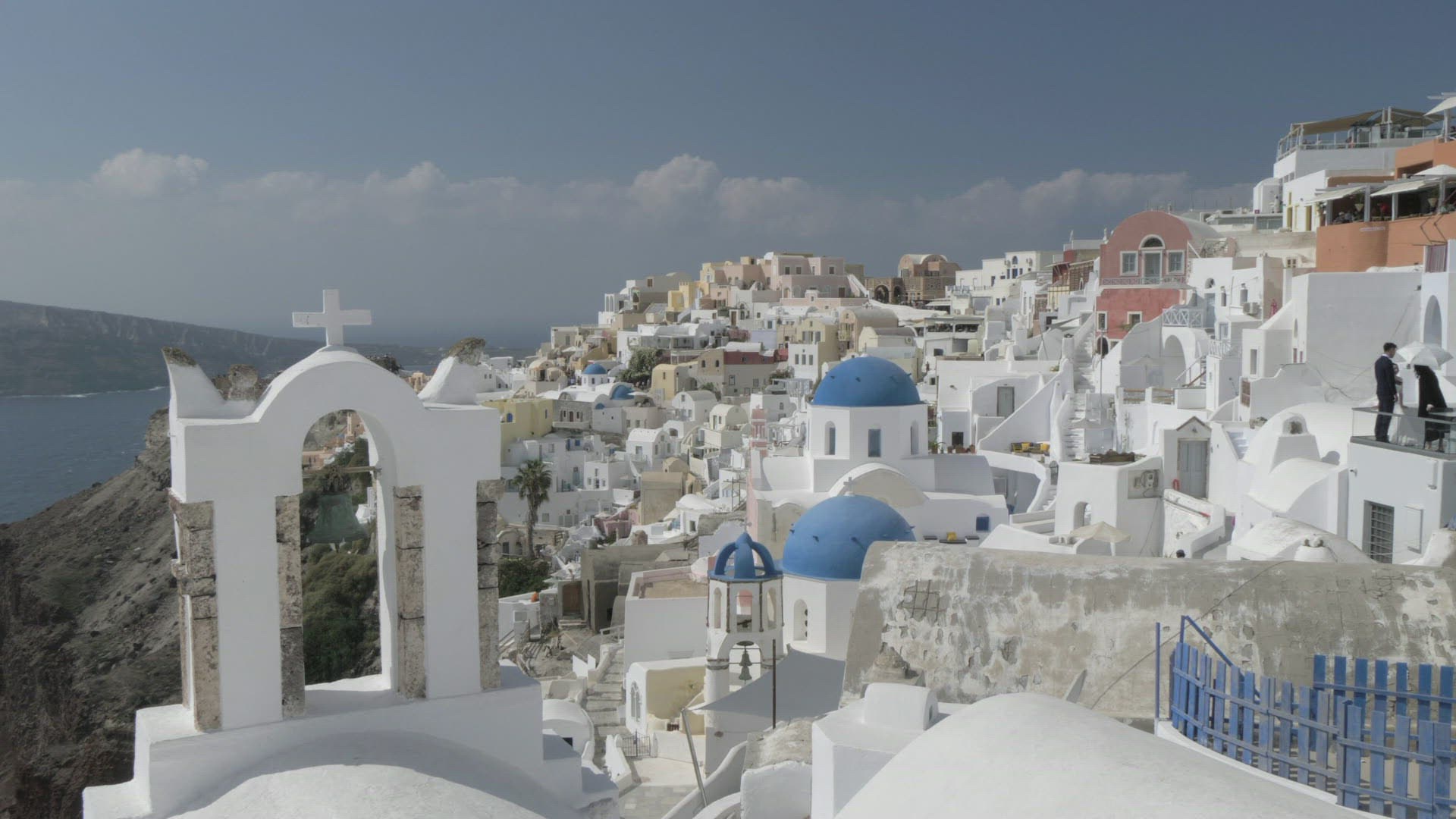 White bell tower in Oia, Santorini, Greece, Europe