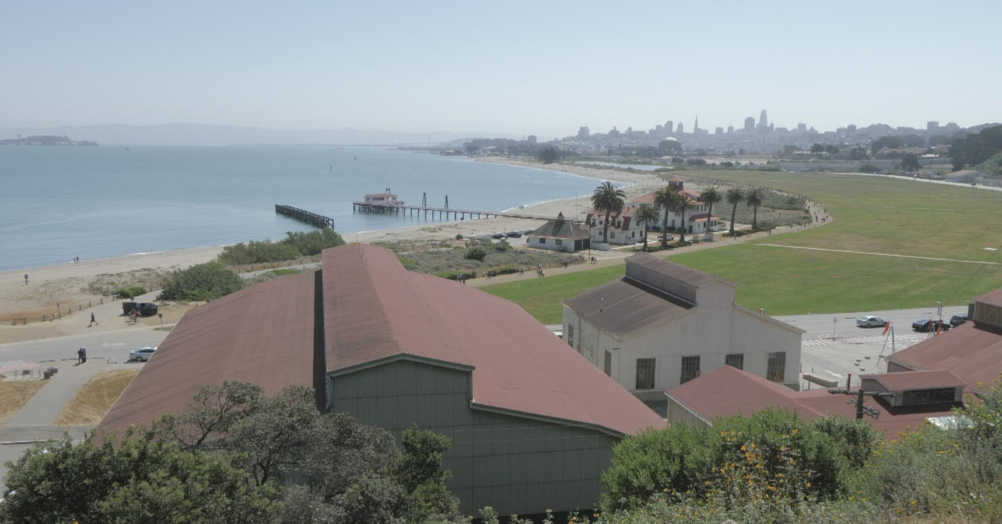 Fort Point sign and city skyline in background; San Francisco; California; United States of America; North America