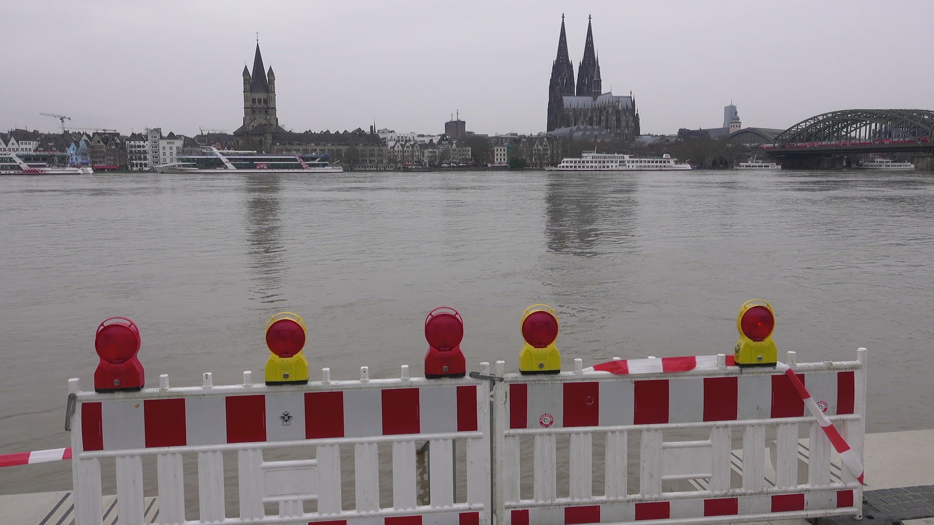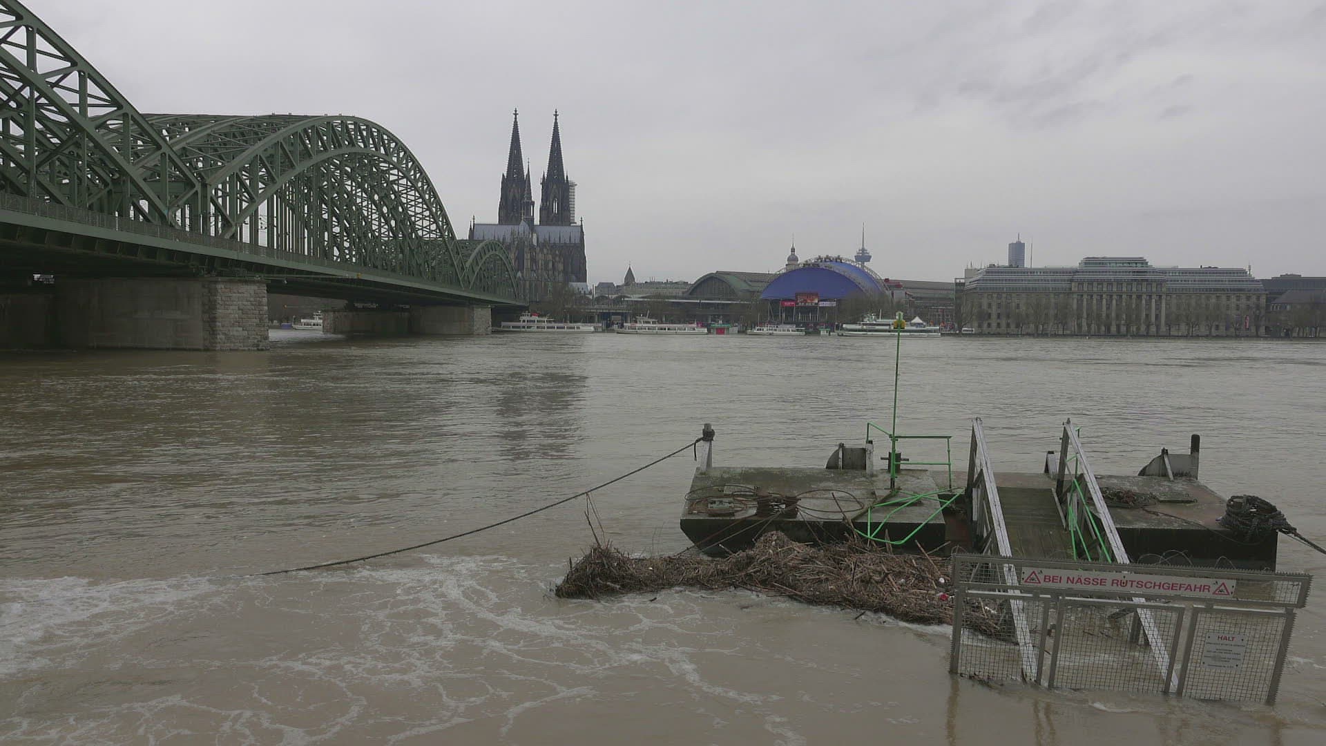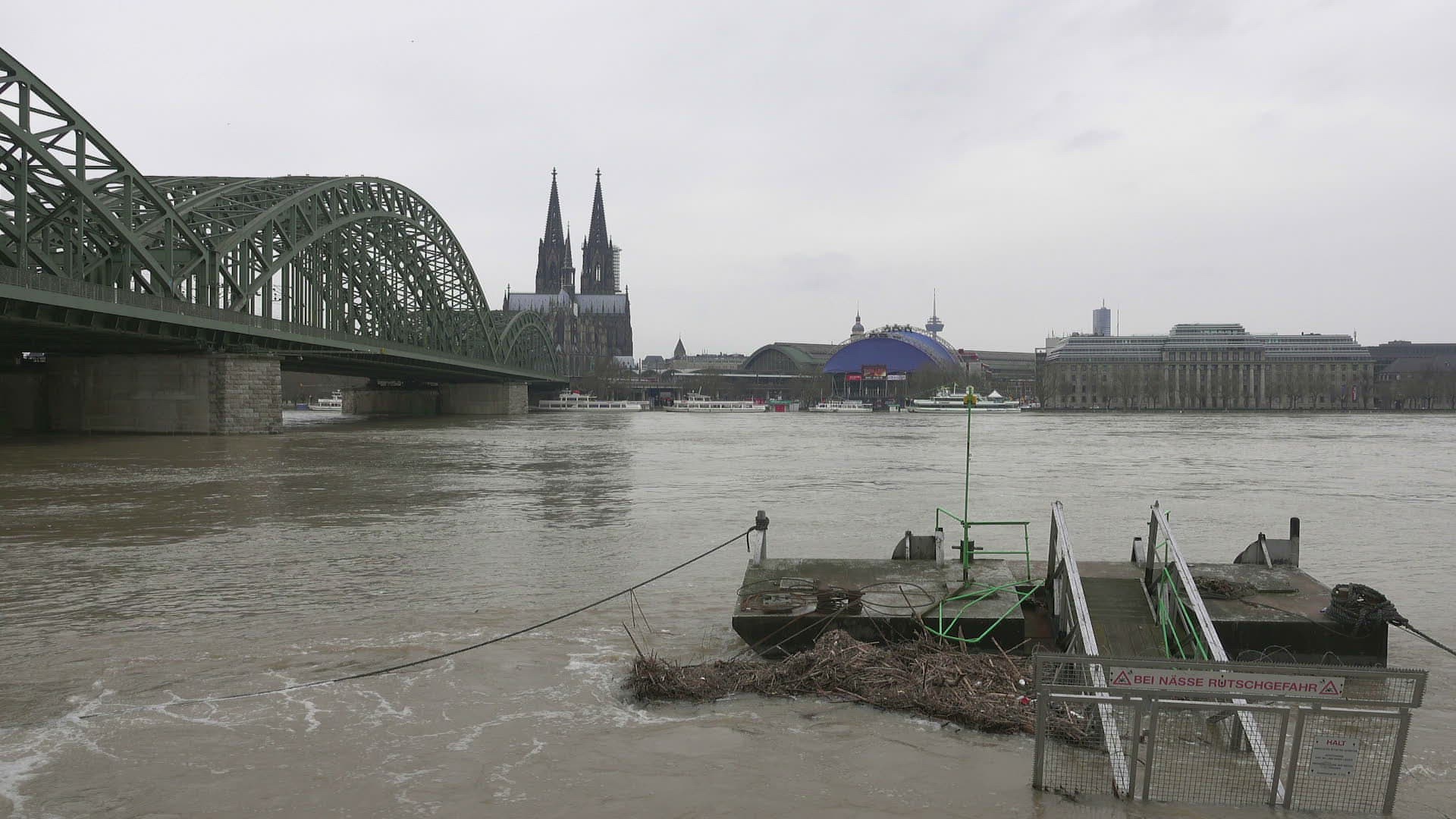 Flood of river Rhine at Deutzer Werft; Cologne; January 2018; North Rhine-Westphalia; Germany
