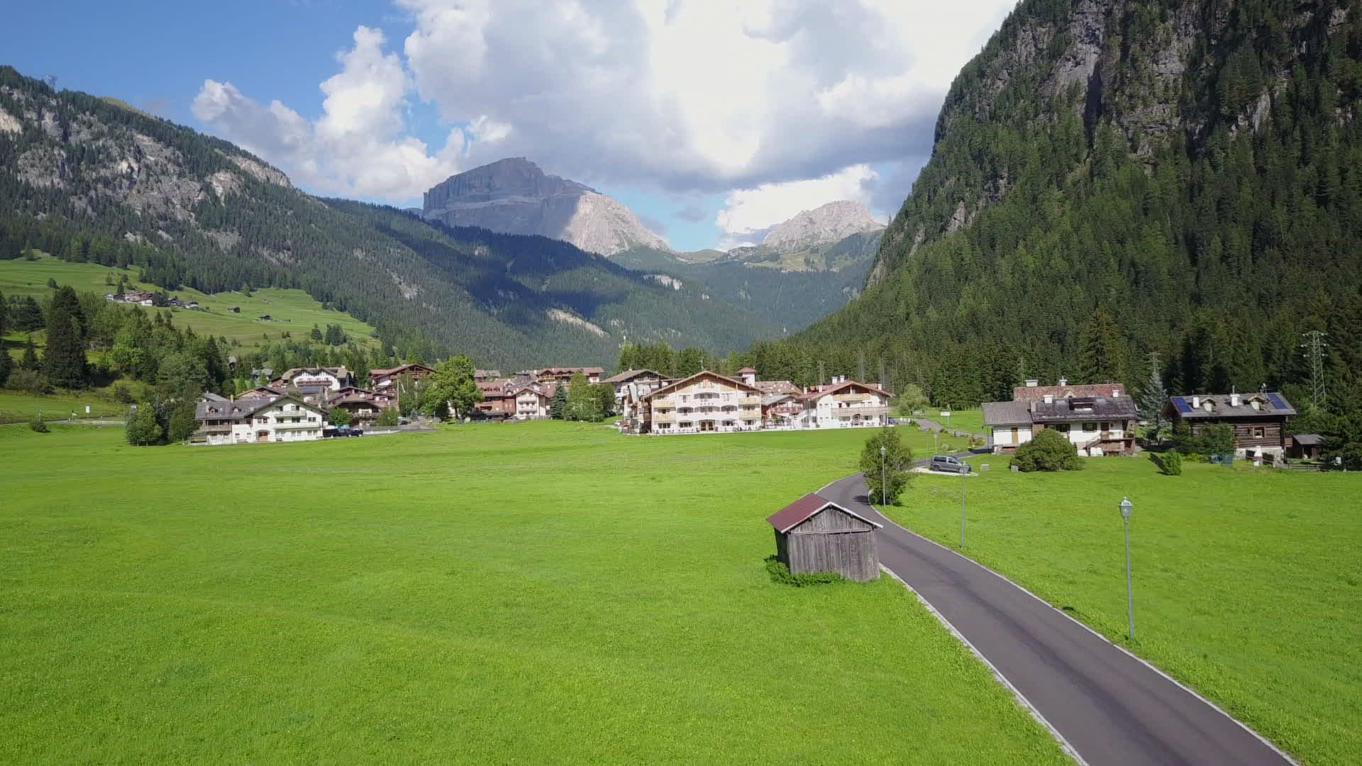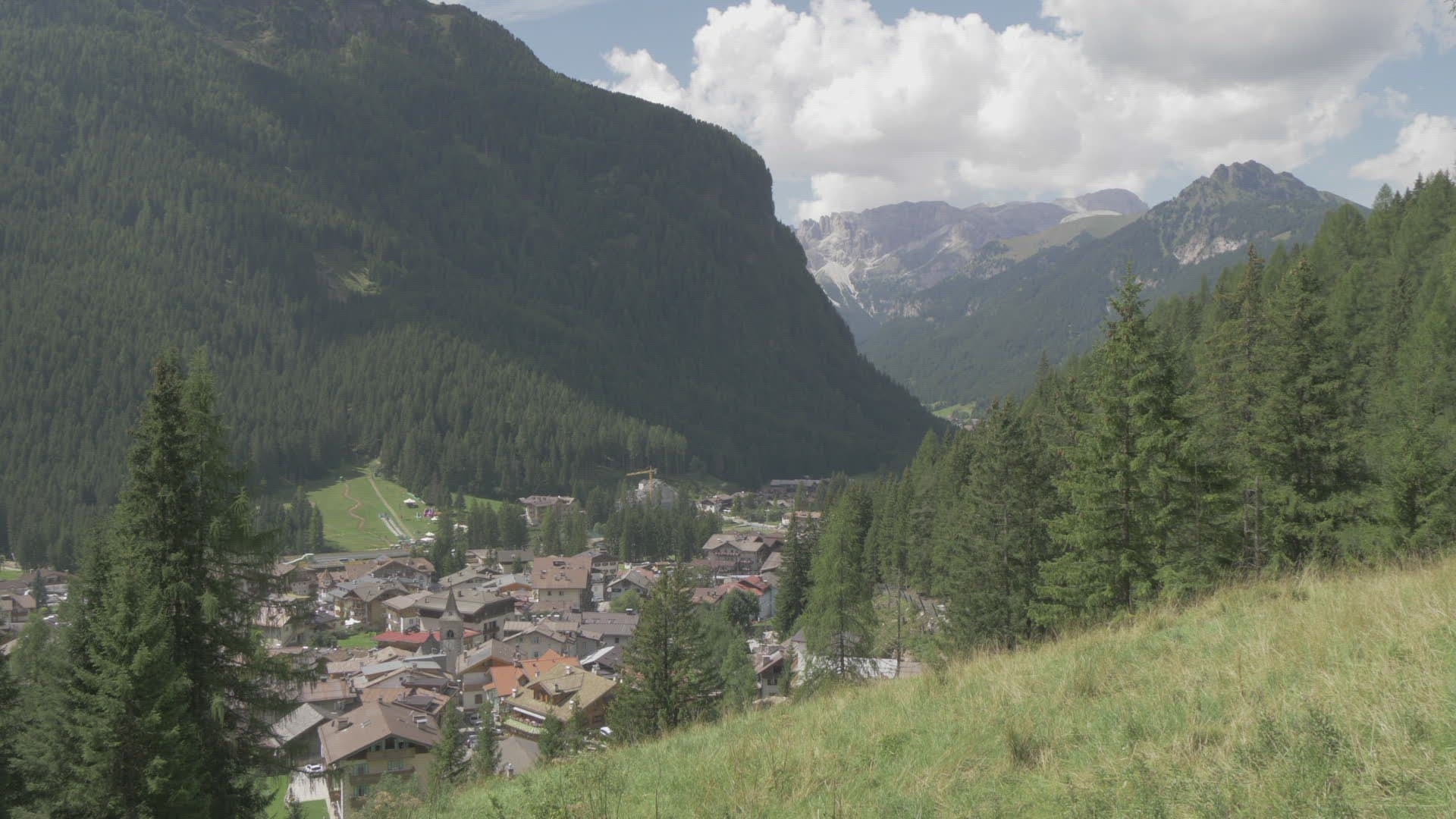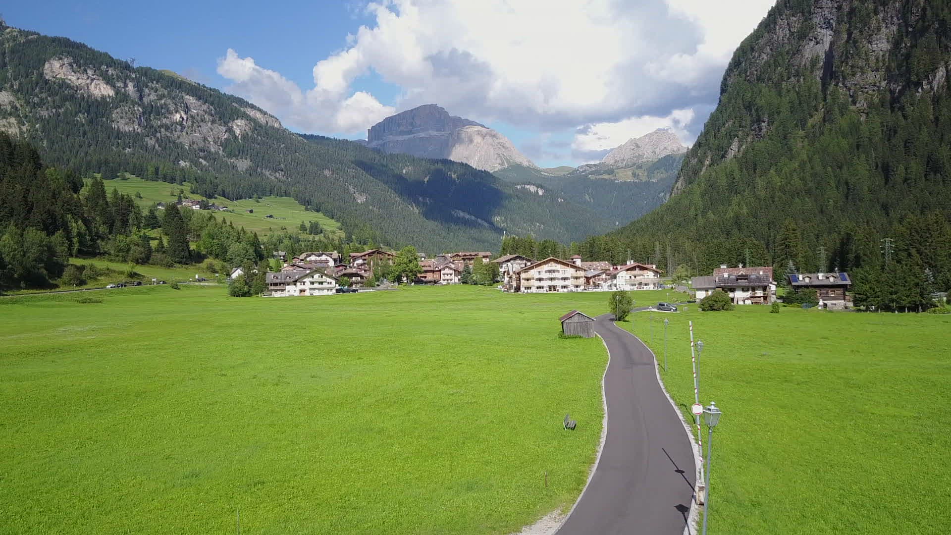 View of river and walk bridge in Canazei; Fassa Valley; Province of Trento; South Tyrol; Italian Dolomites; Italy; Europe